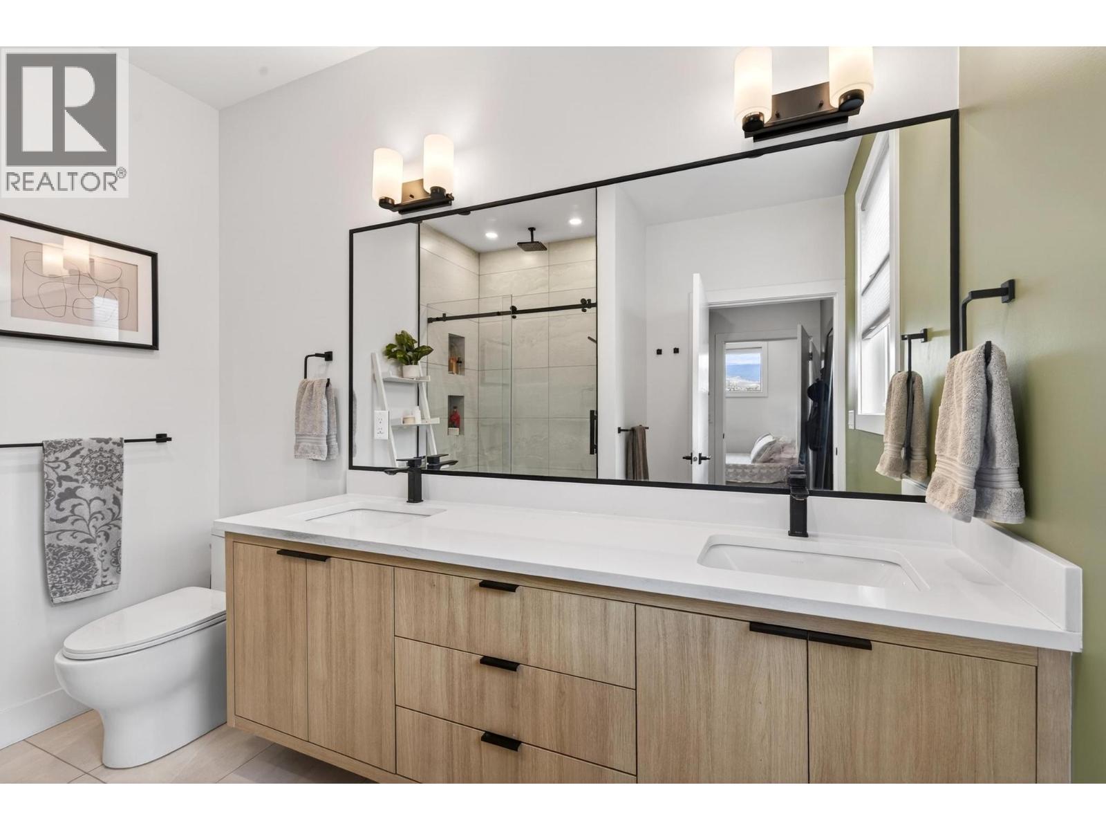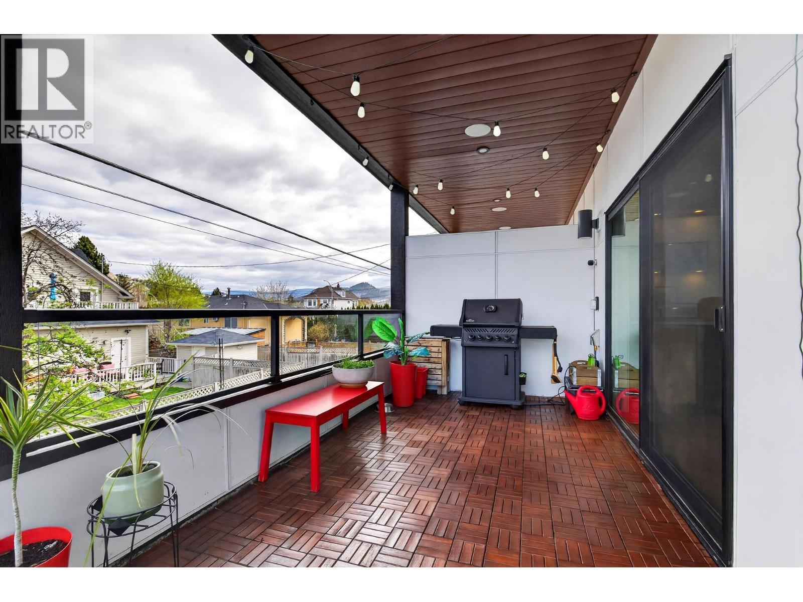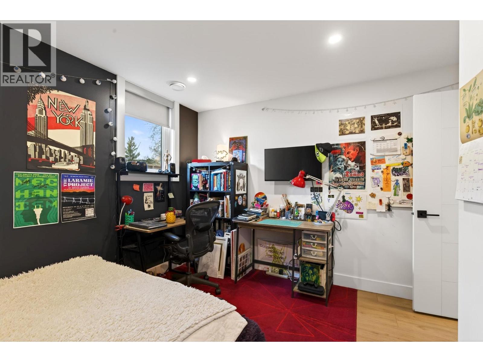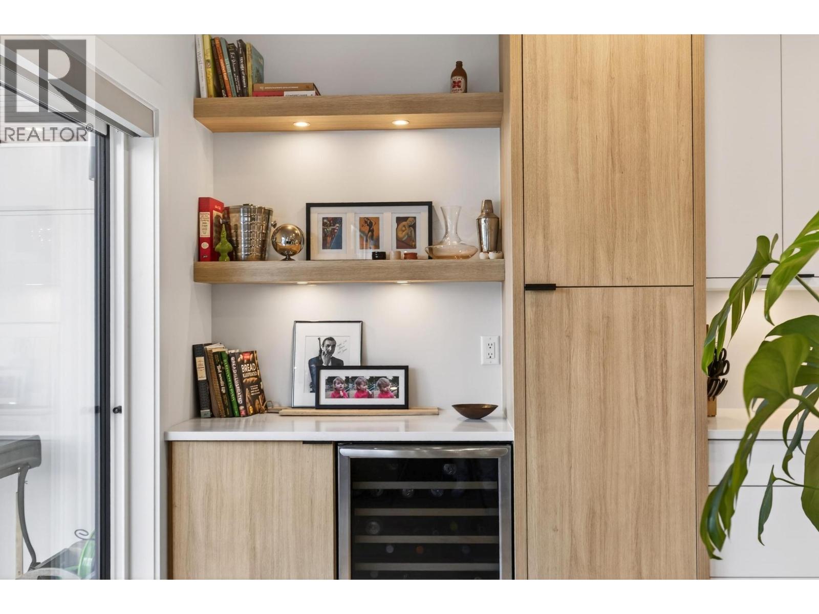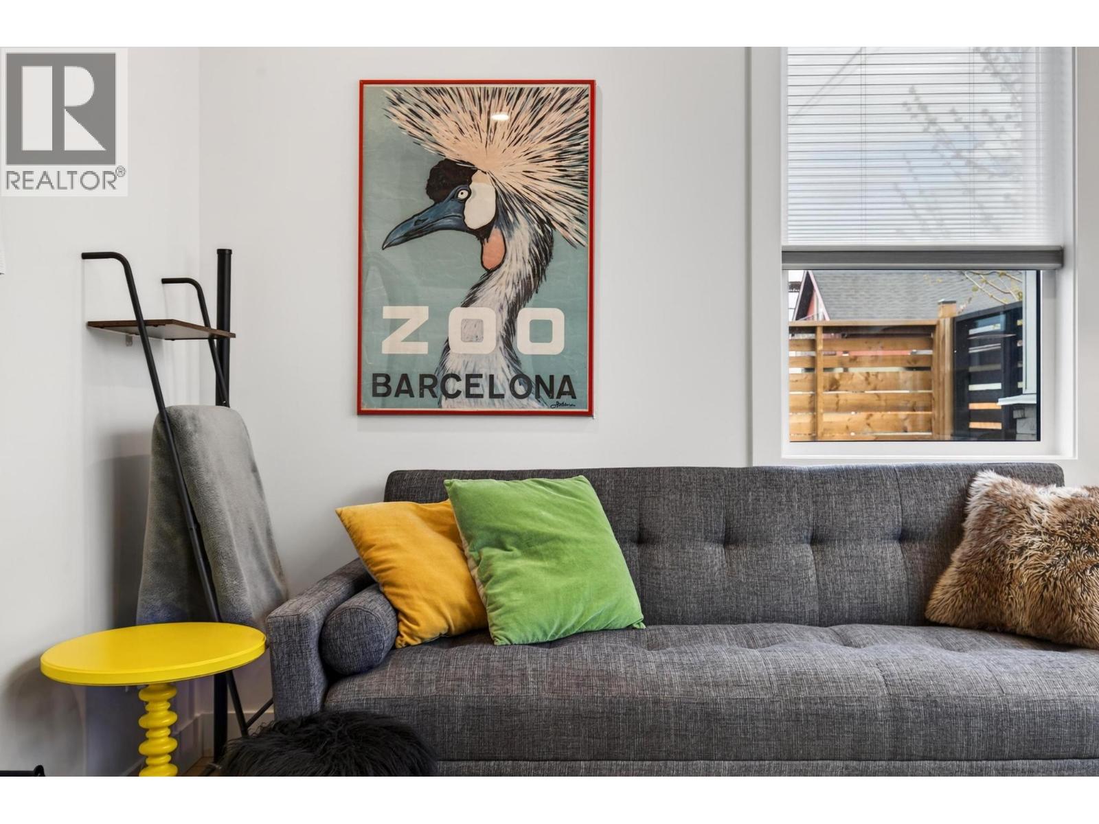 Rare 1,800 sq ft, 4-bed, 3-bath townhome in Downtown Kelowna — and this one comes completely turnkey! The sellers have added post-possession upgrades so you skip the landscaping, fencing, blinds, paint, and finish work that most new builds leave for year one. Upgrades include a custom fenced courtyard with gate and low-maintenance rock-scaping; automated blinds throughout; a designer paint package with accent walls and a full-height staircase feature wall; a custom mural wallpaper and black ceiling in the powder room; Ecobee thermostat; ceiling fan in the primary; added shelving in the foyer closet and kitchen; and a built-out garage with bike hangars. The entry level offers three bedrooms, a full bath, laundry, interior access to the private attached garage, and EV charger ready. Upstairs features 9-foot ceilings, oversized energy-efficient windows, a 10-foot quartz waterfall island, Fisher & Paykel panel-ready appliances, custom cabinetry, and a built-in bar with wine cooler. Living and dining open onto a covered patio with natural gas and built-in speakers. The primary suite is upstairs with a walk-through closet and 5-piece ensuite. Pet-friendly. Mountain and city views. Walking distance to everything downtown. (id:62999)