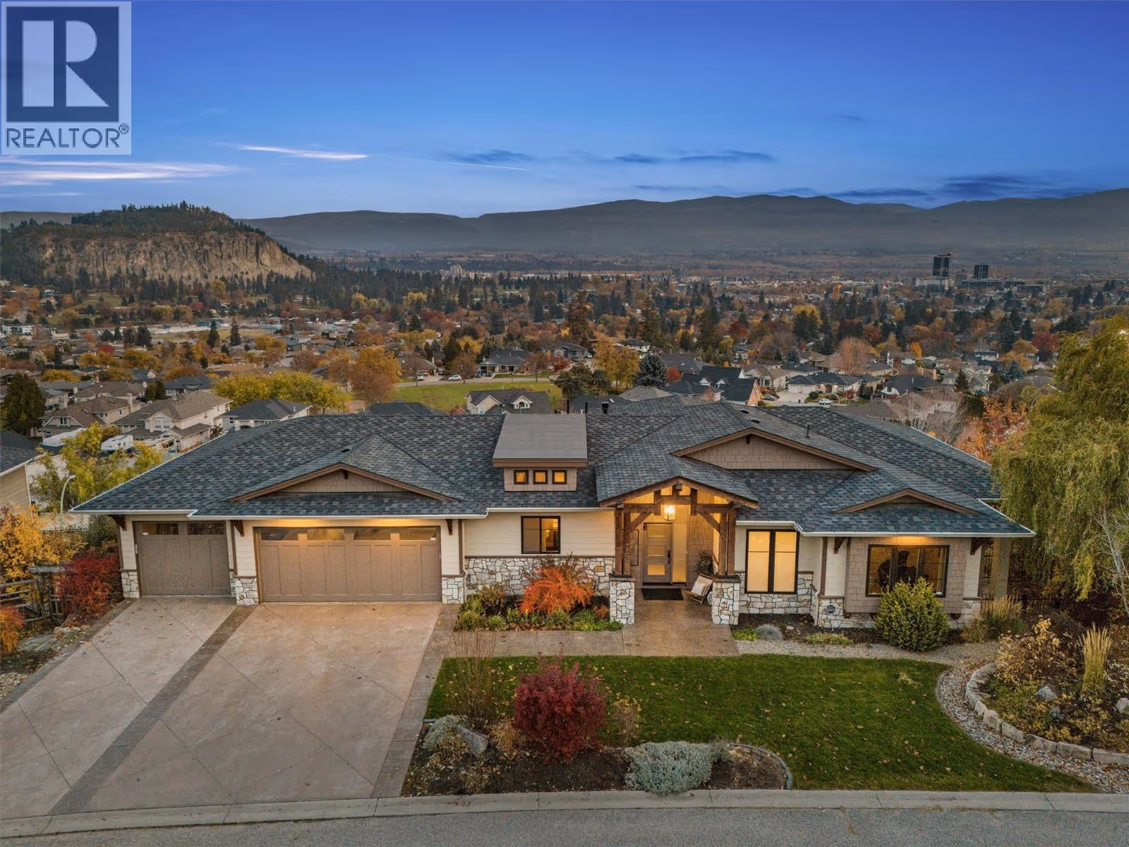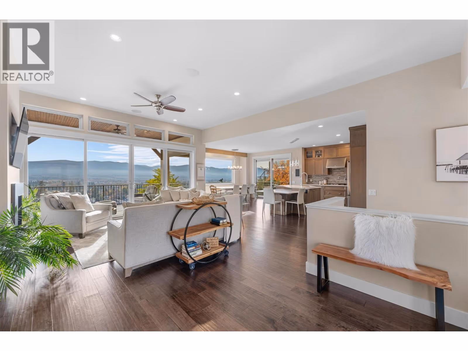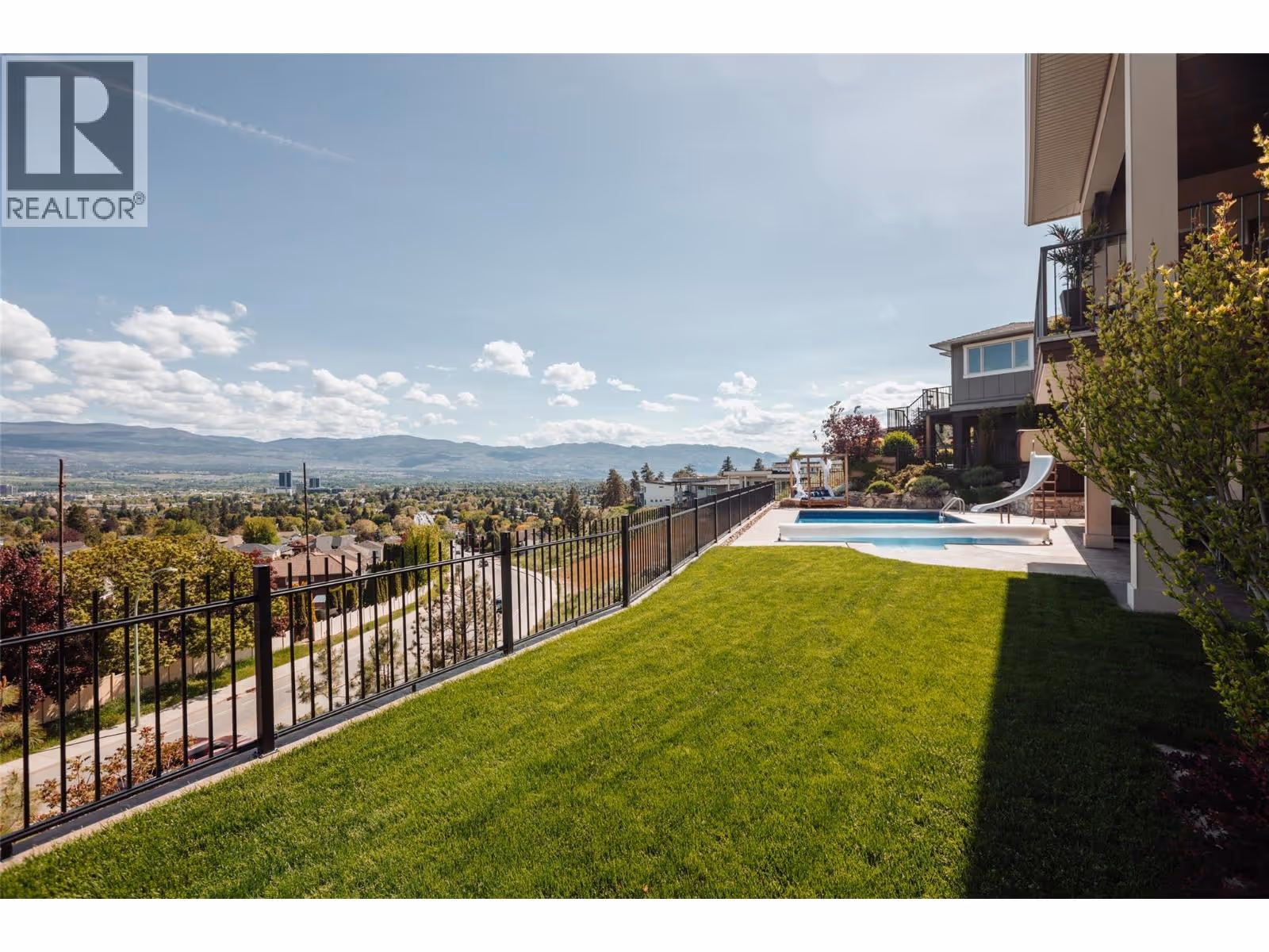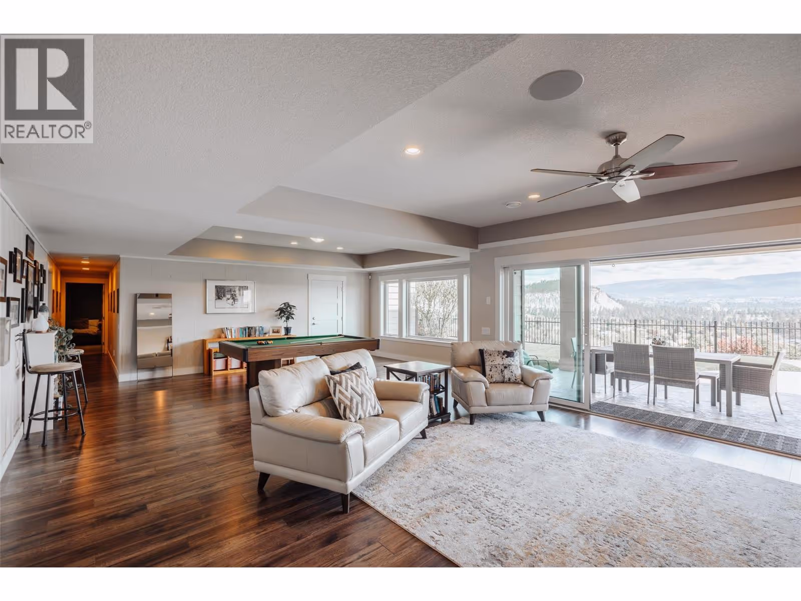 This meticulously crafted walkout rancher offers the best of Okanagan living. A wall of windows frames views of Dilworth Mountain, the city skyline, and Okanagan Lake. The open-concept main level features hardwood floors, 11’ ceilings, and a wraparound sun deck perfect for morning coffee or evening wine. A gas fireplace and dual sliding doors with phantom screens enhance the bright, open feel. The chef’s kitchen is outfitted with GE Cafe appliances, a gas stove with pot filler, quartz counters, and a two-tiered island. Soft-close white oak cabinetry, open shelving, and hidden organizers elevate the functionality. The dining space includes built-in bench seating and access to the deck and BBQ area. The primary suite showcases city views, a spa-inspired ensuite, soaker tub, glass shower, heated tile floors, dual vanities, and a walk-in closet with custom built-ins. A second bedroom or office and powder room round out the main floor. Downstairs offers a bright rec room, wet bar, theater room, two bedrooms, and a 5-piece bath. Outside, enjoy your private oasis: in-ground heated pool, hot tub and a fully fenced yard. Other features include radiant in-floor heating on the lower level, Sonos speakers throughout, Navien instant hot water, triple car garage and multi-zone irrigation. A 1-bed legal suite with private entrance adds flexibility for guests or family. Close to downtown, bus routes and Knox Mountain hiking and biking trails, this home blends comfort, luxury, and location. (id:62999)
