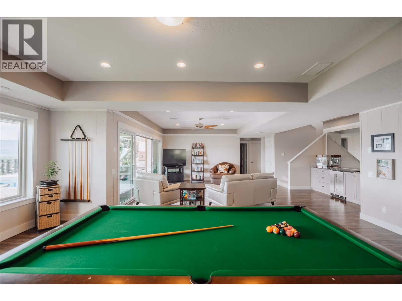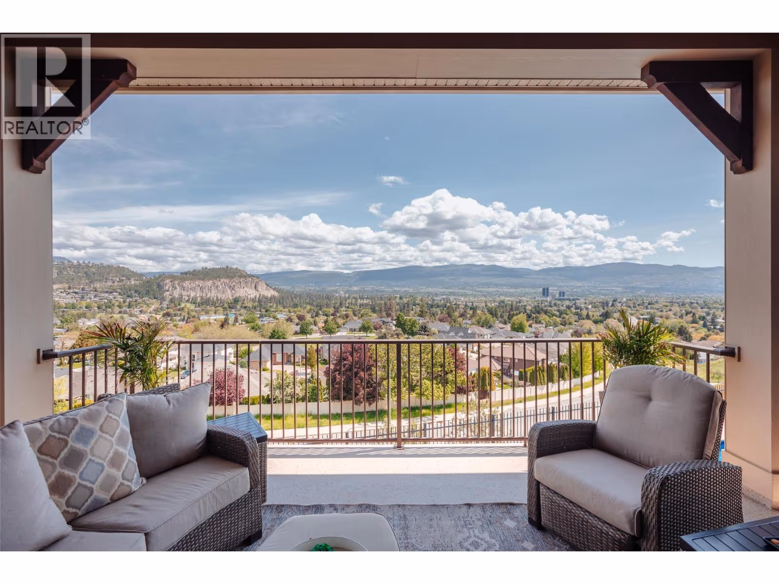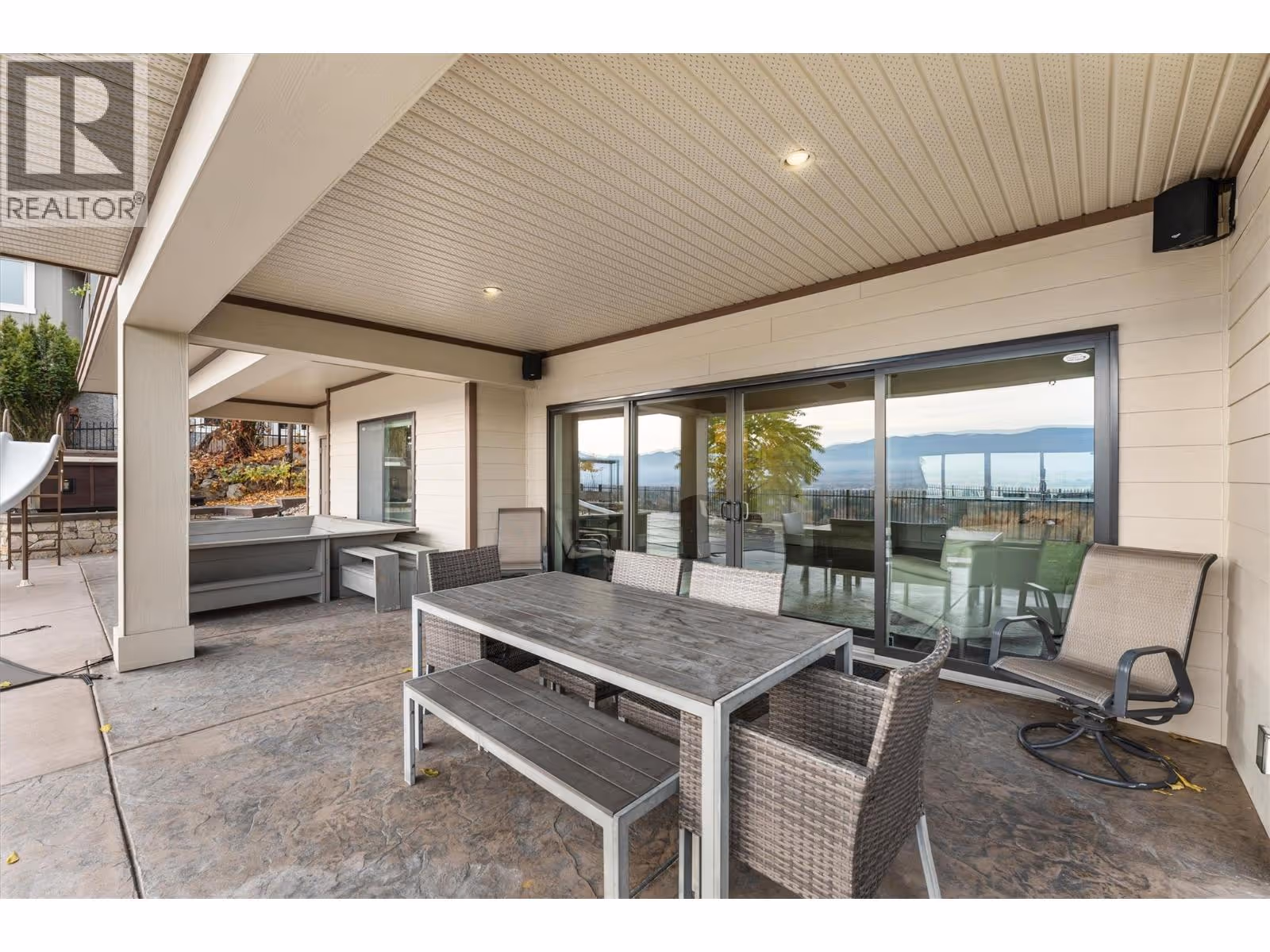This meticulously crafted walkout rancher offers the best of Okanagan living. A wall of windows frames views of Dilworth Mountain, the city skyline, and Okanagan Lake. The open-concept main level features hardwood floors, 11’ ceilings, and a wraparound sun deck perfect for morning coffee or evening wine. A gas fireplace and dual sliding doors with phantom screens enhance the bright, open feel. The chef’s kitchen is outfitted with GE Cafe appliances, a gas stove with pot filler, quartz counters, and a two-tiered island. Soft-close white oak cabinetry, open shelving, and hidden organizers elevate the functionality. The dining space includes built-in bench seating and access to the deck and BBQ area. The primary suite showcases city views, a spa-inspired ensuite, soaker tub, glass shower, heated tile floors, dual vanities, and a walk-in closet with custom built-ins. A second bedroom or office and powder room round out the main floor. Downstairs offers a bright rec room, wet bar, theater room, two bedrooms, and a 5-piece bath. Outside, enjoy your private oasis: in-ground heated pool, hot tub and a fully fenced yard. Other features include radiant in-floor heating on the lower level, Sonos speakers throughout, Navien instant hot water, triple car garage and multi-zone irrigation. A 1-bed legal suite with private entrance adds flexibility for guests or family. Close to downtown, bus routes and Knox Mountain hiking and biking trails, this home blends comfort, luxury, and location. (id:62999)