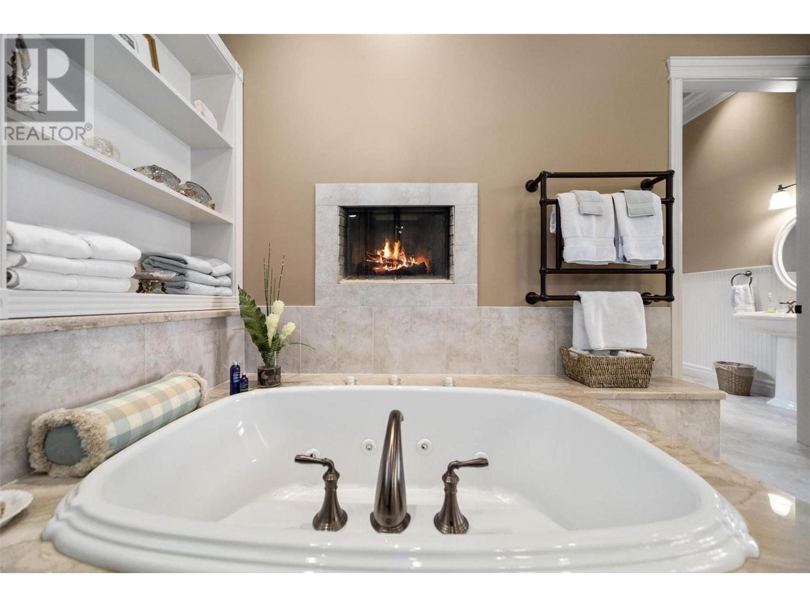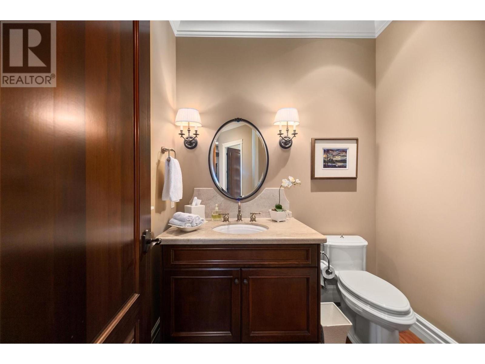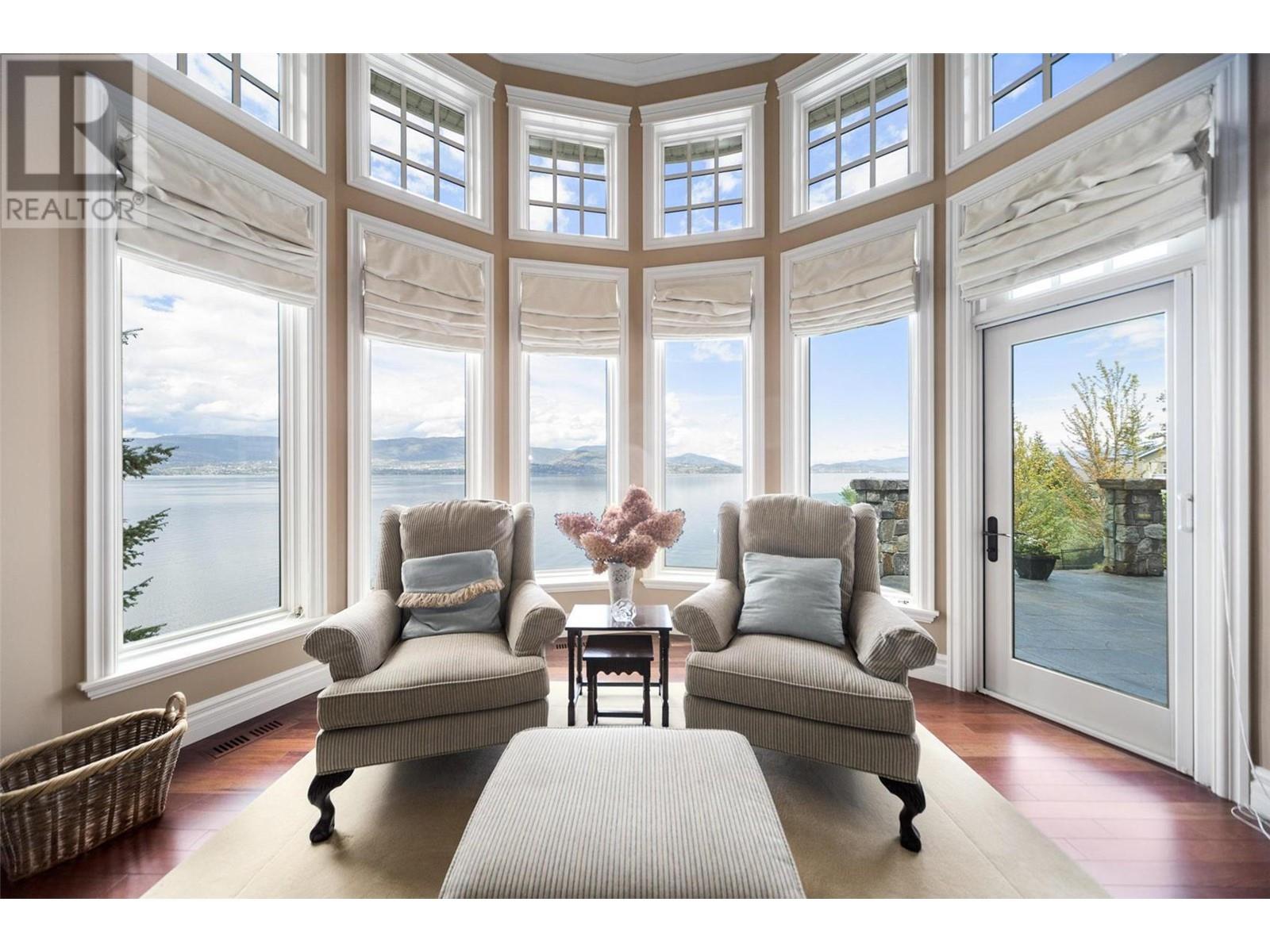 Lakefront vineyard estate home on 2.31 private acres w/160’ of sandy beach. State of the art geothermal heating/cooling and green living eco septic system. European chateau inspired boasts a new dock, elevator, wine cellar, private vineyard, office, gym + theatre. 8000 sq ft, 5 bdrm, 8 bath. Main floor primary suite w/ reading area + fireplace, luxury hotel like bath, great room w/soaring ceilings, stone fireplace and French doors that lead out to a lakefront patio w/ sunset views. The chateau kitchen w/ best in class Wolf/SubZero appliances, lakeview kitchen table along w/bar seating, formal dining room, main floor laundry and a wet bar round. The upper level w/2 large bdrms w/ensuites and huge family/guest suite w/ensuite, laundry, kitchenette. The lower level has a gym +spa bath, wine cellar, games rm, theatre, sauna, family rm and a large office w/ensuite. Elevator + accessible ramps. 4 car garage plus bonus storage. Explore your options to add a guest house. Outdoor kitchen/hot tub. Licenced dock w/power lift. Htd tile floors, Pella windows, state of the art water filtration/controls, htd driveway. Smart Lutron system w/power blinds, custom lighting, audio, alarm. Timeless design w/ tile roof, copper gutters and Kettle Valley stone exterior. A relaxing waterfall entrance. Private vineyard w/90 Chardonnay vines with room to expand vineyard. Mins to the award winning Cedar Creek + Martins Lake wineries, Bertram Park and the amenities of Lower Mission. Room for pool. (id:62999)