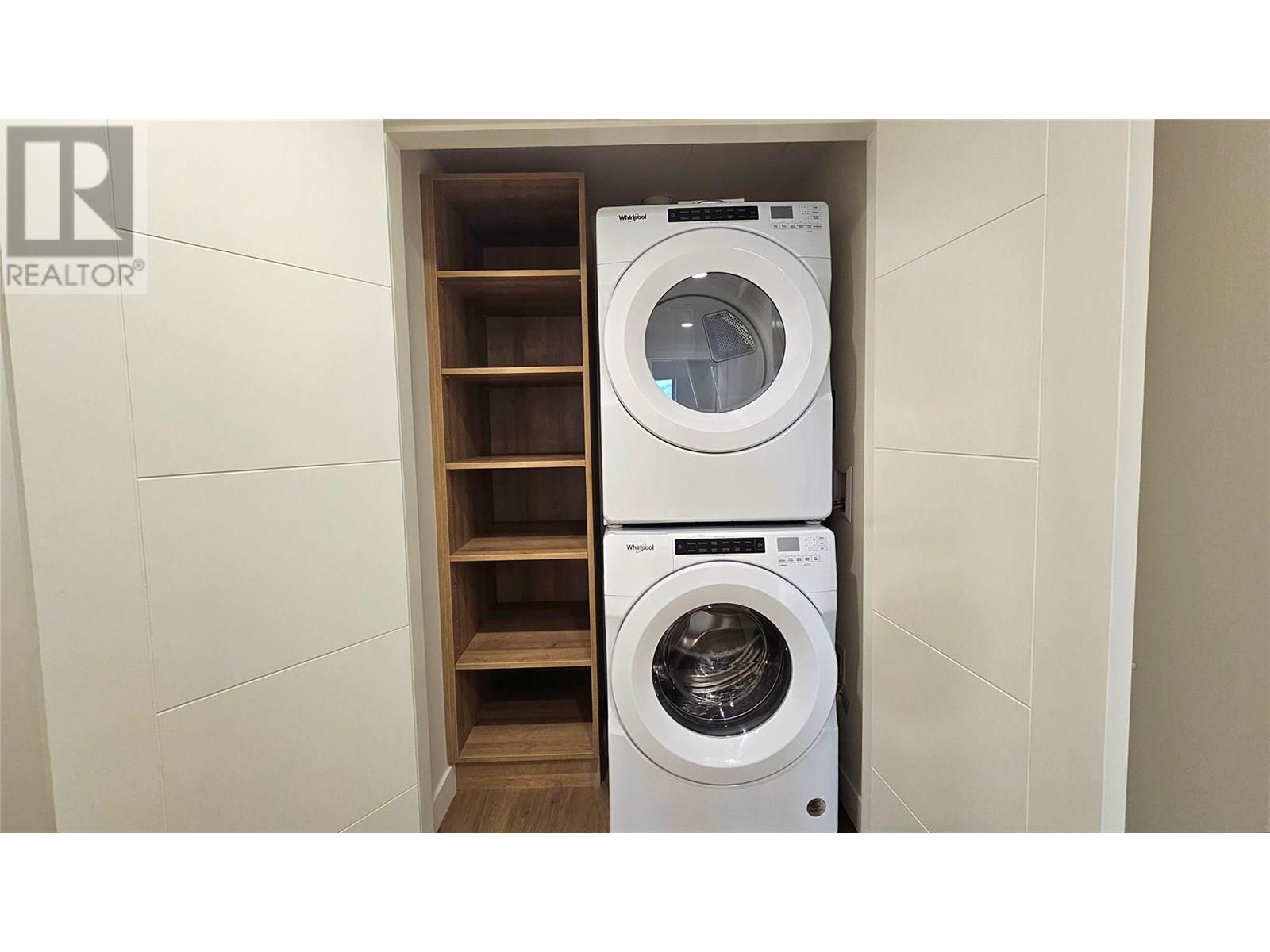 Welcome to lakeside luxury resort-style living at AQUA Phase 1 by Mission Group. Embrace the essence of waterfront relaxation in this South-East-facing 2-bed, 2-bath corner unit with charming patio, 1 secured covered parking stall, offering tranquil and mountain views. Deluxe closets organizers and laundry organizers upgrades. Dive into a lifestyle of leisure as you step into the world-class Aqua Boat Club, ready to embark on adventures of surf and sun across Lake Okanagan. 15 story solid concrete construction, 8"" of concrete between floors, oversized windows, central hot water system (included in strata fees), quiet & efficient heating & cooling in through VRV (variable refrigerant volume) & ERV (energy recovery ventilator) systems, fiber-optics wired, quartz countertops, premium stainless-steel appliance package, pet-friendly with no size restrictions. AQUA offers outdoor pool & hot tub on the 5th floor, lounge seating, landscaped BBQ area, two-story 2000 sq ft gym & yoga/meditation area, co-workspace, poolside fireside lounge, shared kitchen, dog wash station. Priority access to membership opportunities at the onsite world-class Aqua Boat Club (at current market rates, subject to availability). This stunning home invites you to explore the vibrant waterfront lifestyle, lined with enticing shops & delectable restaurants. 2-5-10 year new home warranty. GST Applicable. Measurements are approximate and should be verified if deemed important. (id:62999)