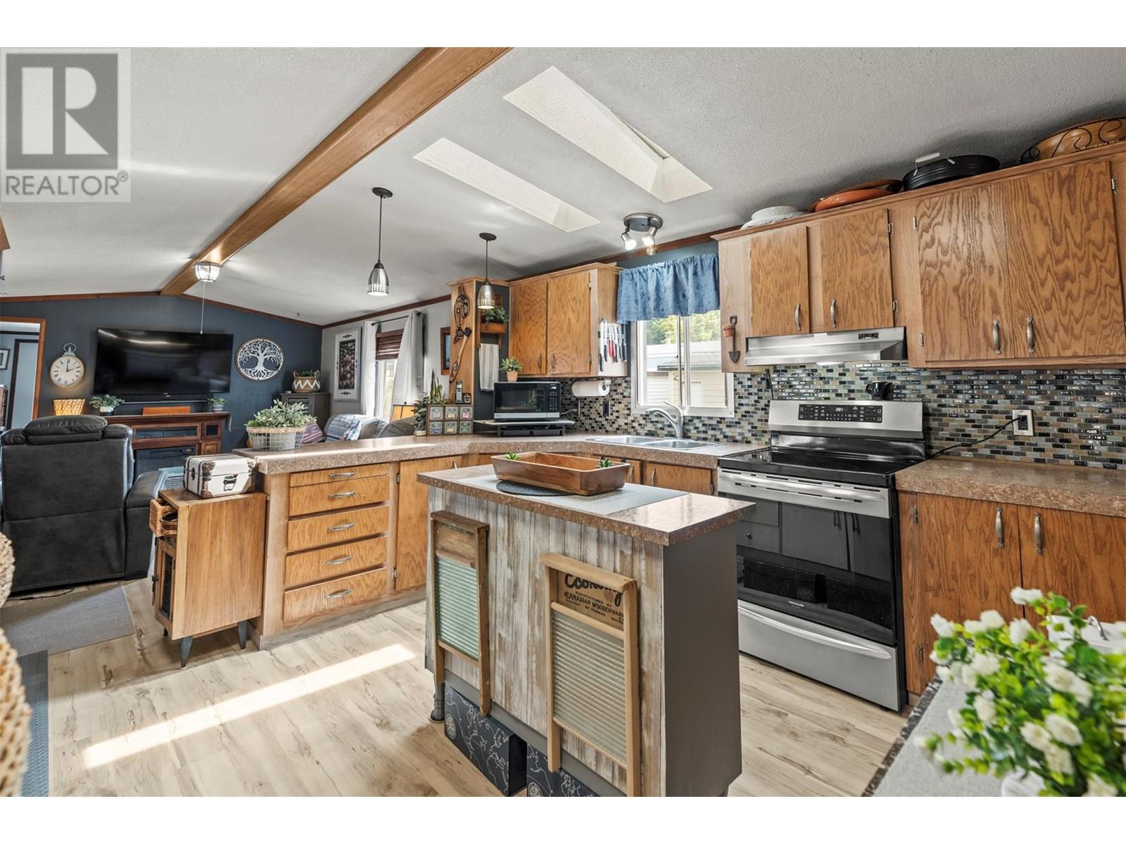 Welcome to Belaire Estates in Lake Country—where comfort meets craftsmanship just minutes from lakes, trails, and amenities. This beautifully updated 2-bedroom, 2-bathroom home is designed for effortless living with thoughtful upgrades throughout. The open-concept layout is filled with natural light from three tinted skylights, enhancing the stylish vinyl plank flooring that flows seamlessly throughout. Wall strips have been removed and professionally plastered for a sleek finish with fresh new paint, and all doors and hardware have been upgraded to elevate the overall aesthetic. The kitchen offers generous counter space and connects effortlessly to the dining and living areas—perfect for relaxed entertaining. Bedrooms are ideally placed on opposite ends for added privacy, while the guest bathroom features modern updates. Step outside to your fully fenced yard, large covered patio, three exterior water outlets, and a hot tub ready for year-round enjoyment. The garage is a true standout: oversized, freshly painted, outfitted with abundant power outlets, and previously used as a mechanic’s workshop with a separate man cave area—ideal for hobbies, guests, or creative space. Additional upgrades include PEX plumbing, extra insulation under the home for cold weather protection, and a 2023 roof inspection. 1 pet under 30 lbs allowed. 650+ credit score required. Head lease until 2114. Contact me today for your private tour. (id:62999)