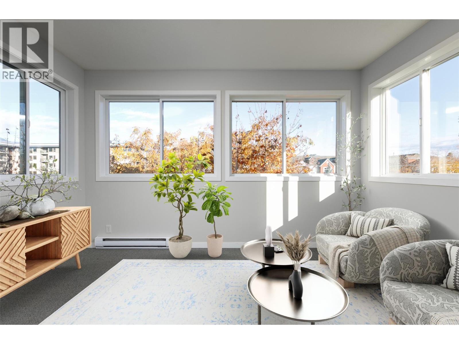 Welcome to The Murano! Location, Location, Location! Enjoy the best of central Kelowna living in this freshly painted and cleaned 2-bedroom, 2-bath corner unit with northeastern exposure and views towards Knox and Dilworth Mountains. Just steps from shops, cafes, and all urban conveniences, this bright and cheerful home offers both comfort and style. Enjoy morning coffee year-round on the enclosed, heated 10x14 patio—a wonderful all-season extension of your living space. Oversized windows with soundproof-grade glass overlook the peaceful 2nd-floor courtyard, where tall, mature trees create a canopy of foliage that softens both sound and scenery for a serene urban retreat. Inside, you’ll find 9' ceilings, timeless shaker cabinetry, and warm wood-tone engineered flooring—a sharp, low-maintenance design that feels instantly welcoming. The split-bedroom layout provides ideal privacy, with principal living spaces in the center. The Murano offers secure entry, two elevators (no long waits!), heated underground parking, and a storage locker. Green living at its best—geothermal heating and cooling are included in the strata fees! No age restrictions and long-term rentals allowed. A fantastic home or investment opportunity in the heart of Kelowna! (id:62999)