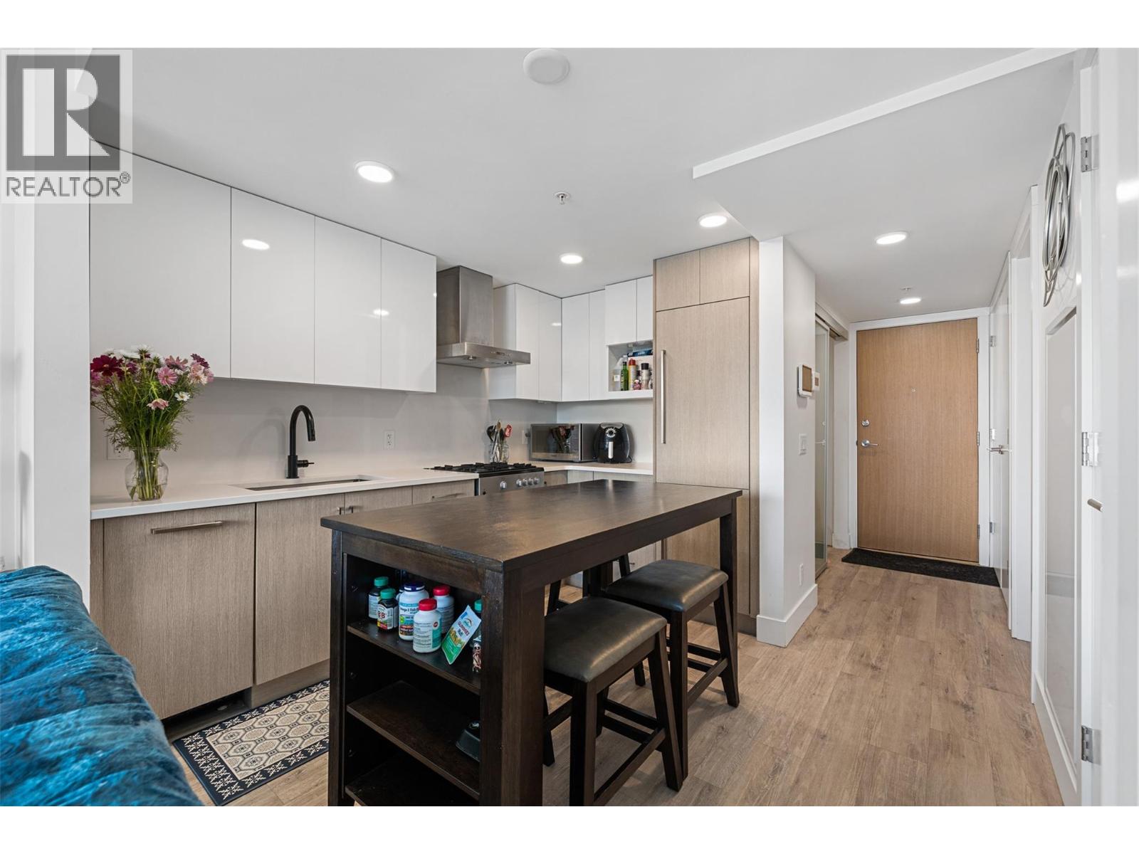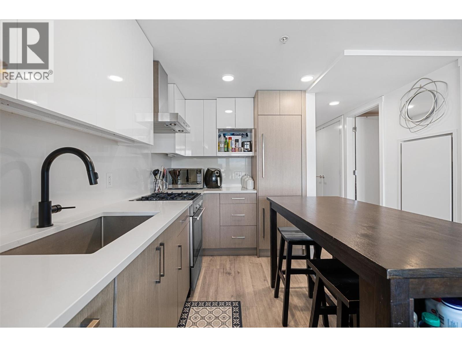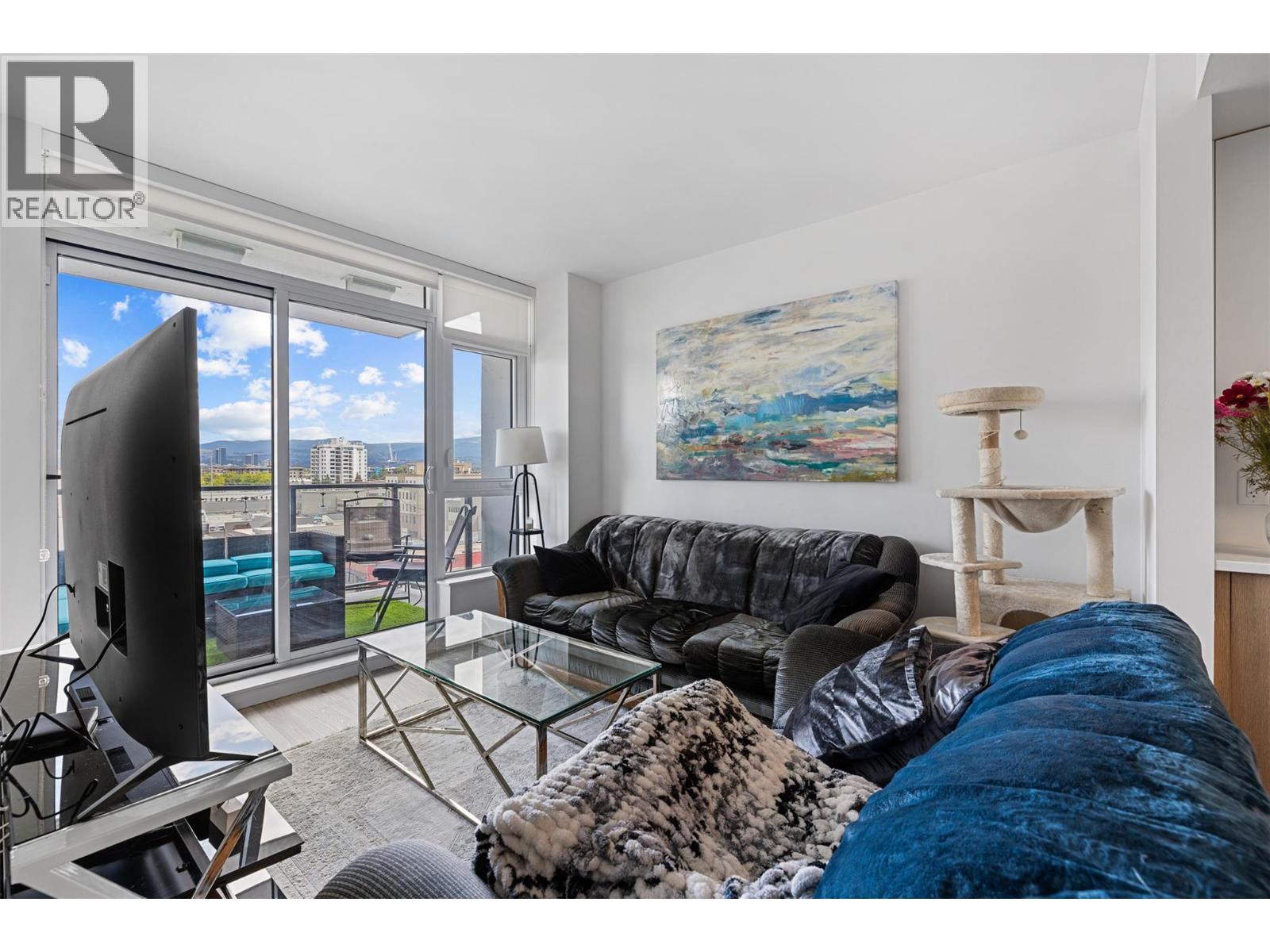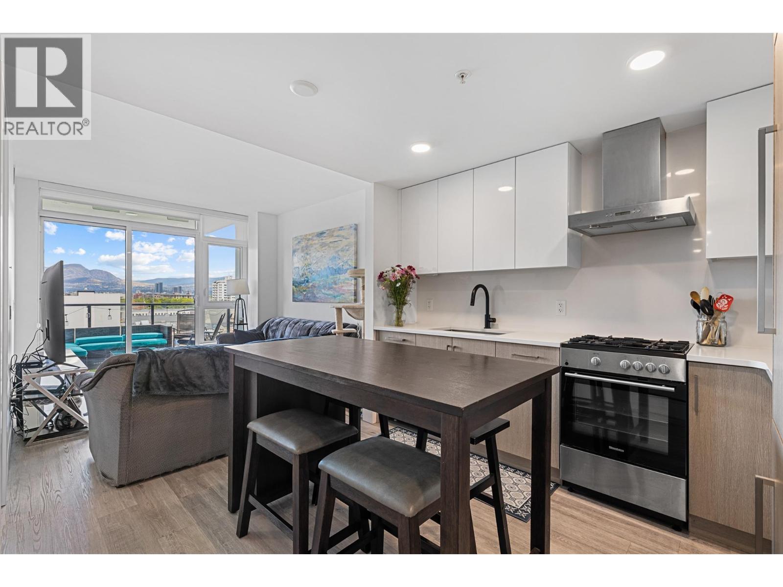 Extraordinary value at ELLA, Kelowna’s most central downtown luxury condo building. This bright East facing one bedroom and den home offers lovely city and mountain views from the 7th floor. Finishings by Award-winning interior design i3 Design Group include quartz countertops throughout the home, soft vinyl plank flooring, surround ceramic tile in the bathroom and under cabinet lighting in the kitchen. Cook gourmet meals on your gas range with quartz backsplash and enjoy the sleek and designer aesthetic of the integrated paneled refrigerator. Located on the corner of Ellis street & Lawrence Ave, this home comes with 1 parking stall in the secure parkade plus 1 secure storage locker. Electric vehicle charging stations are available for ELLA residents’ exclusive use. The building boasts a bike & pet washing station, resident bike storage & guest suite for resident’s visitors. This home offers an in-suite washer & dryer along with ample storage and closet space to make this a functional and comfortable condo. This is the perfect home for affordable downtown living or the savvy investor looking for great value. (id:62999)