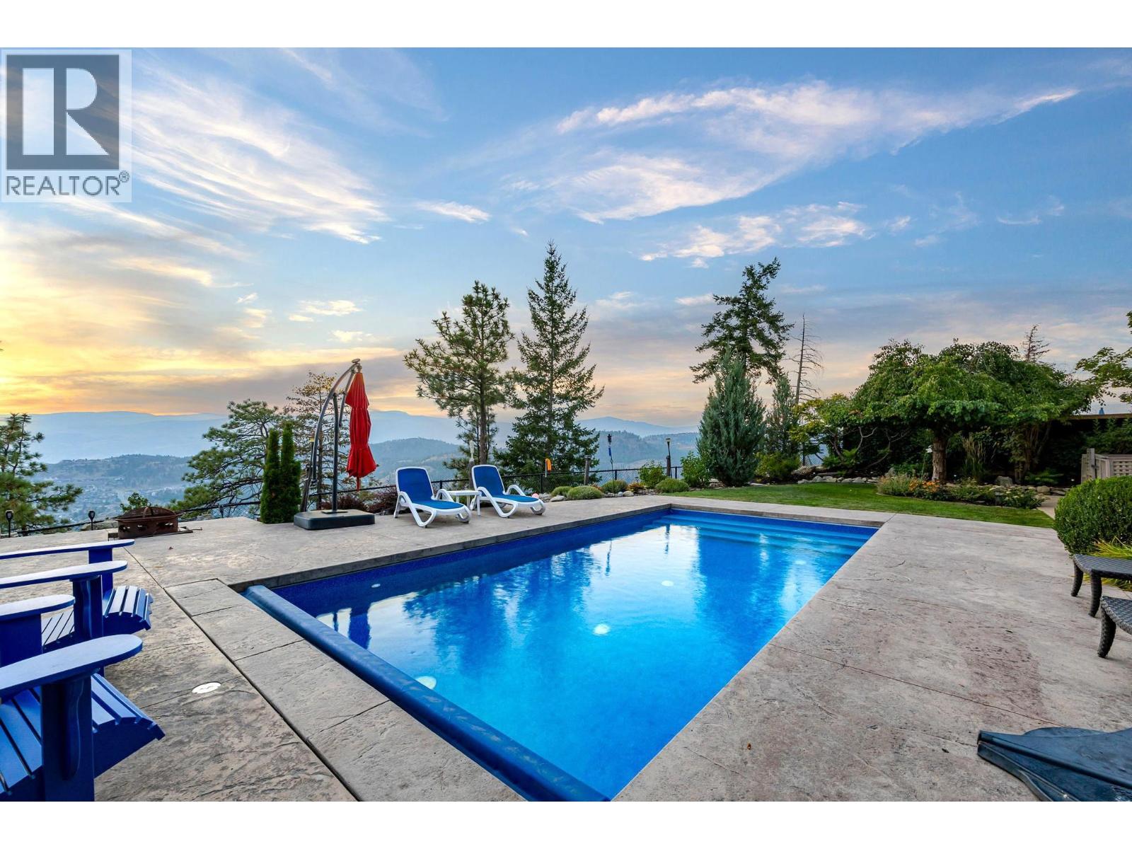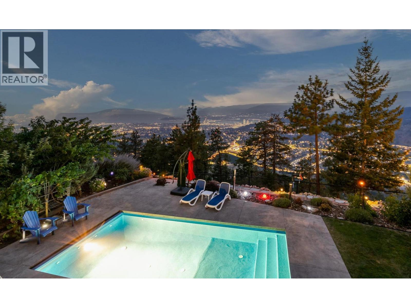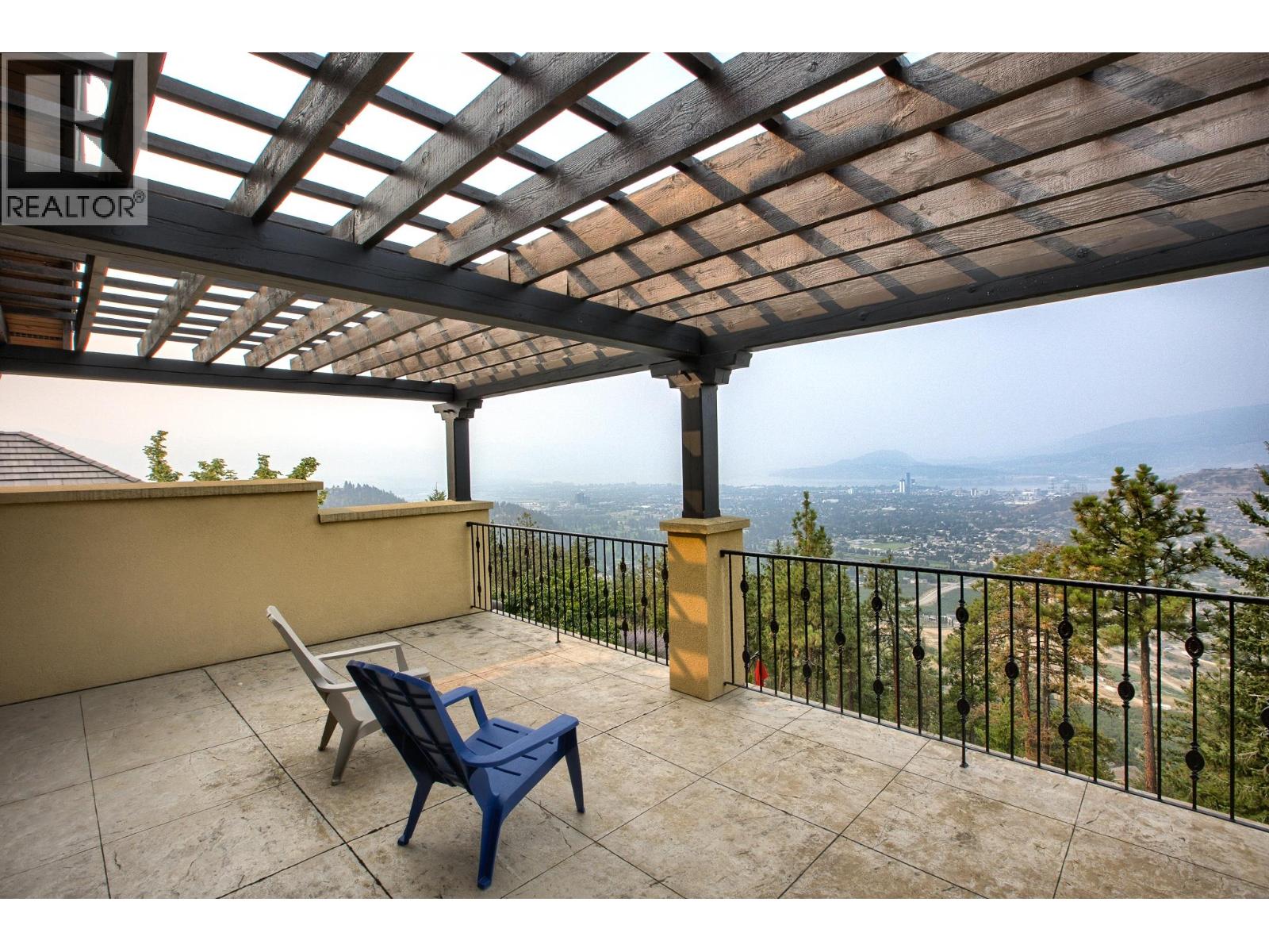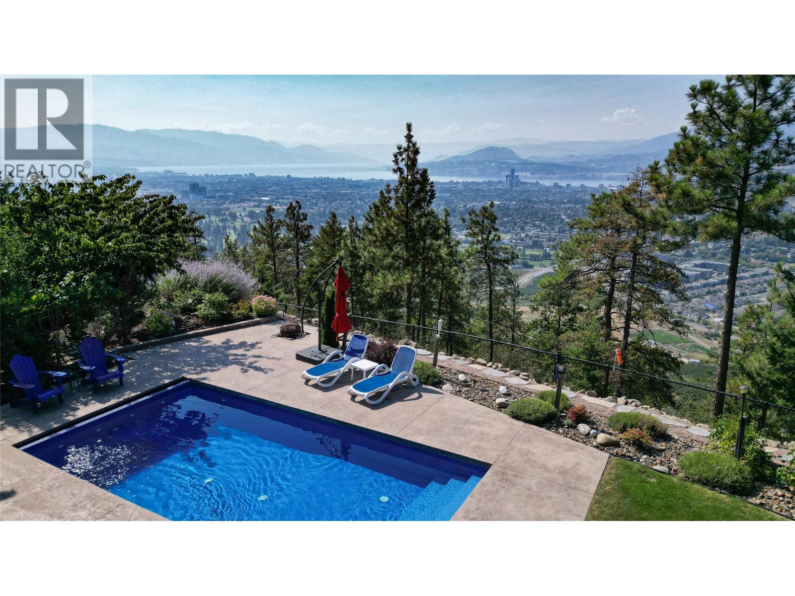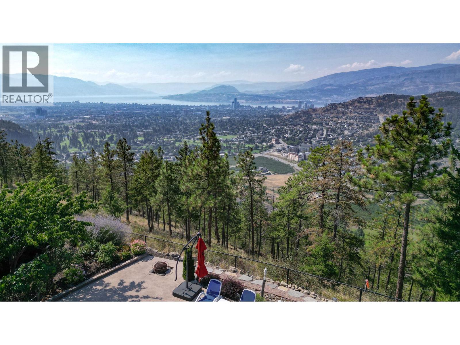 This extraordinary home on Dilworth Mountain is perfectly positioned to capture breathtaking panoramic lake, city, and mountain views. Arrive through the gated, private courtyard, where a tranquil water fountain sets the tone for the elegance within. Designed for both entertaining and everyday comfort, the home seamlessly blends indoor-outdoor living with soaring vaulted ceilings, expansive nano glass doors leading to a large deck, bringing the outdoors in. The gourmet kitchen is appointed with top-of-the-line appliances, granite counters, alder cabinetry, travertine finishes, and a pantry providing additional storage. The great room exudes warmth and relaxation with its floor-to-ceiling fireplace, exposed beams, and rich hardwood floors. Upstairs, the lavish primary suite is a sanctuary unto itself, featuring a lounge area with fireplace and French doors to a deck showing off the spectacular city and lake views. The fully equipped ensuite offers a double shower and stand-alone tub, complemented by an oversized walk-in closet, dressing room, and private laundry. A flex room off the ensuite provides space for an office/nursery and has its own private and shaded deck. The lower level boasts three bedrooms and two bathrooms, along with a cozy living room that flows directly to the pool deck. This level also includes a wet bar, fireplace, and secondary laundry. Outdoors, soak in the stunning views from any of the 5 decks/sitting areas, the sparkling pool, or by the stone fireplace. The yard is framed by lush landscaping and fruit trees, creating a private and peaceful retreat. Completing this exceptional property is a spacious double garage, offering ample room for vehicles and storage. (id:62999)