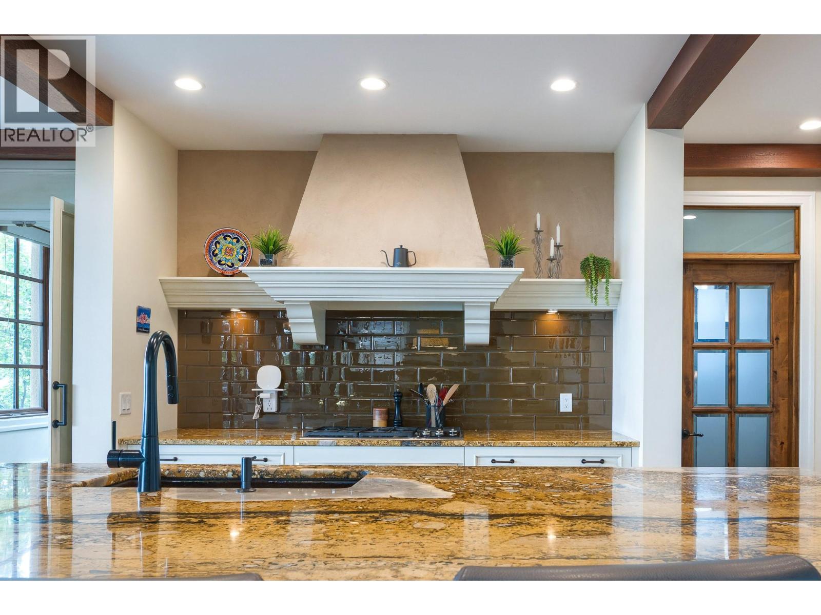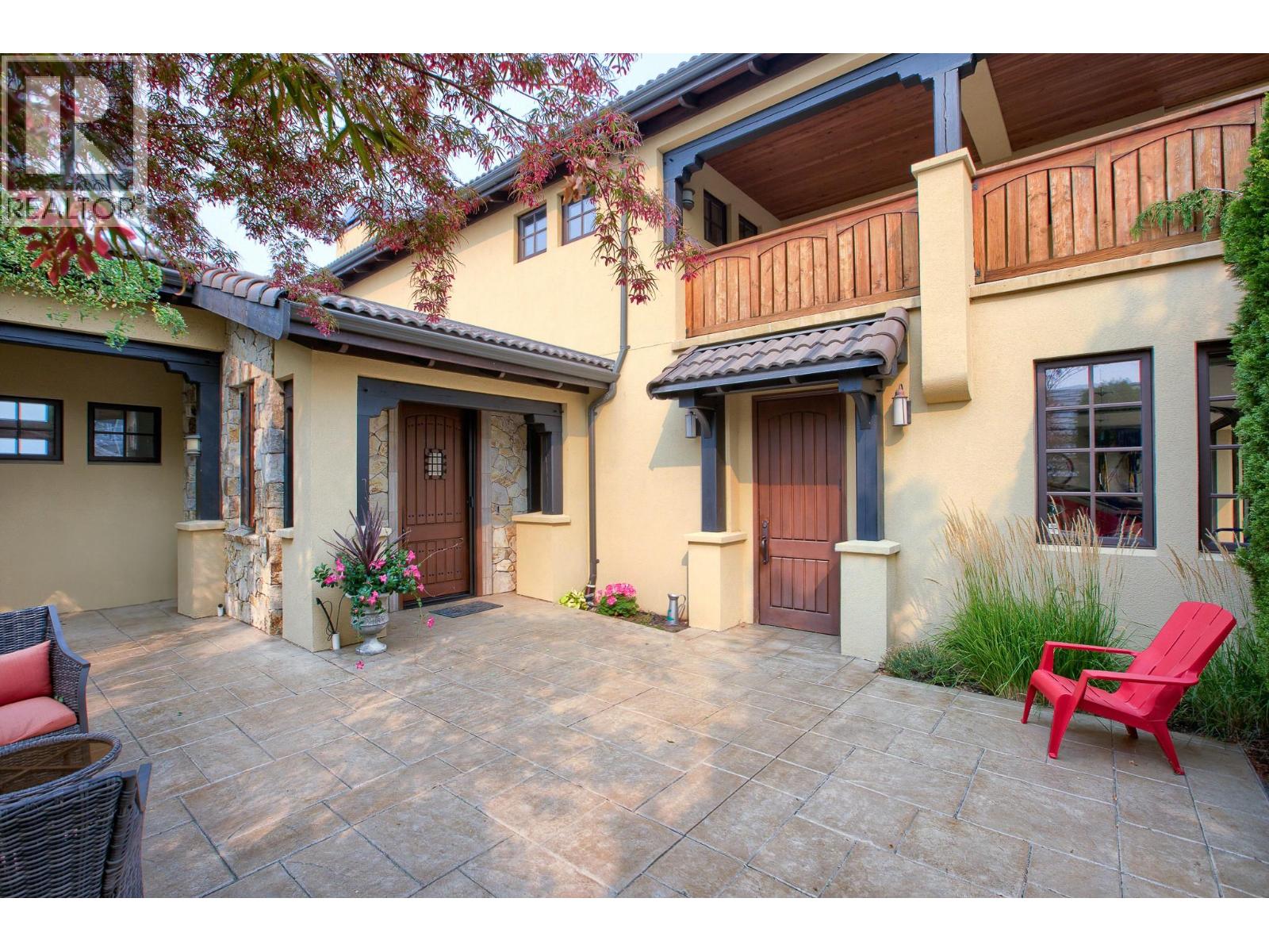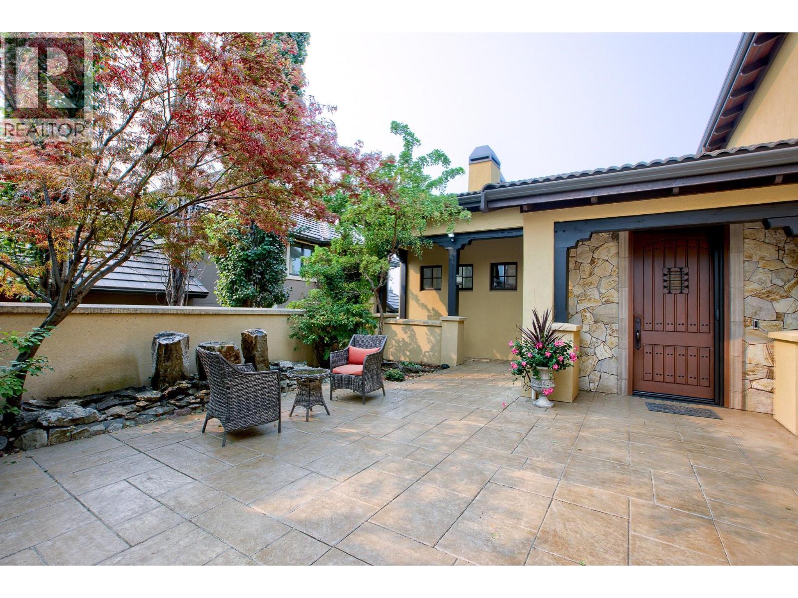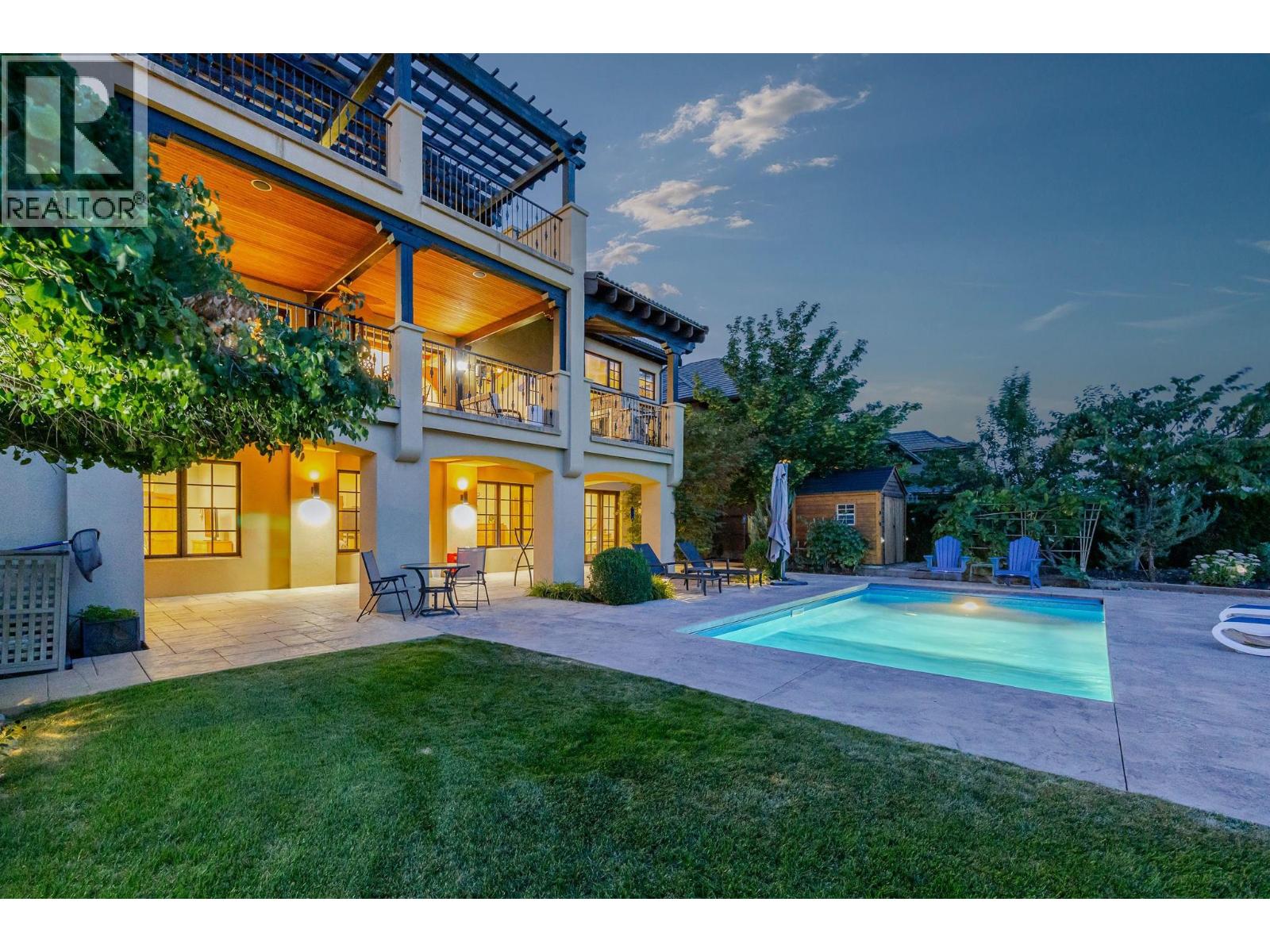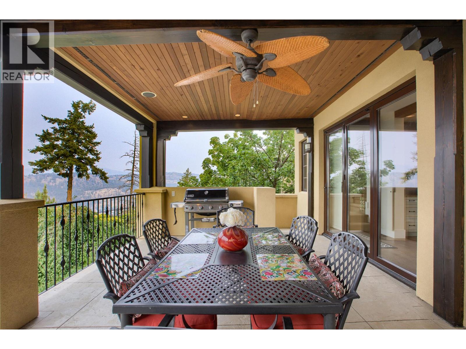 This extraordinary home on Dilworth Mountain is perfectly positioned to capture breathtaking panoramic lake, city, and mountain views. Arrive through the gated, private courtyard, where a tranquil water fountain sets the tone for the elegance within. Designed for both entertaining and everyday comfort, the home seamlessly blends indoor-outdoor living with soaring vaulted ceilings, expansive nano glass doors leading to a large deck, bringing the outdoors in. The gourmet kitchen is appointed with top-of-the-line appliances, granite counters, alder cabinetry, travertine finishes, and a pantry providing additional storage. The great room exudes warmth and relaxation with its floor-to-ceiling fireplace, exposed beams, and rich hardwood floors. Upstairs, the lavish primary suite is a sanctuary unto itself, featuring a lounge area with fireplace and French doors to a deck showing off the spectacular city and lake views. The fully equipped ensuite offers a double shower and stand-alone tub, complemented by an oversized walk-in closet, dressing room, and private laundry. A flex room off the ensuite provides space for an office/nursery and has its own private and shaded deck. The lower level boasts three bedrooms and two bathrooms, along with a cozy living room that flows directly to the pool deck. This level also includes a wet bar, fireplace, and secondary laundry. Outdoors, soak in the stunning views from any of the 5 decks/sitting areas, the sparkling pool, or by the stone fireplace. The yard is framed by lush landscaping and fruit trees, creating a private and peaceful retreat. Completing this exceptional property is a spacious double garage, offering ample room for vehicles and storage. (id:62999)