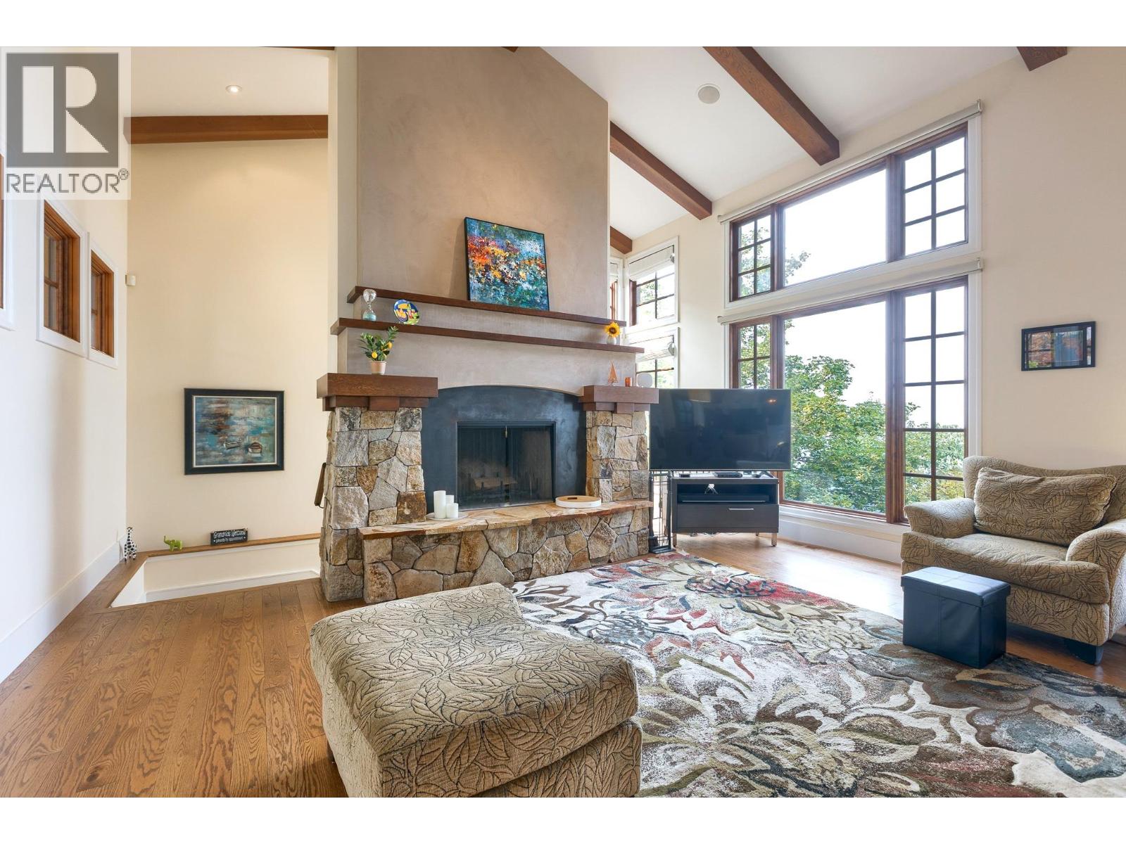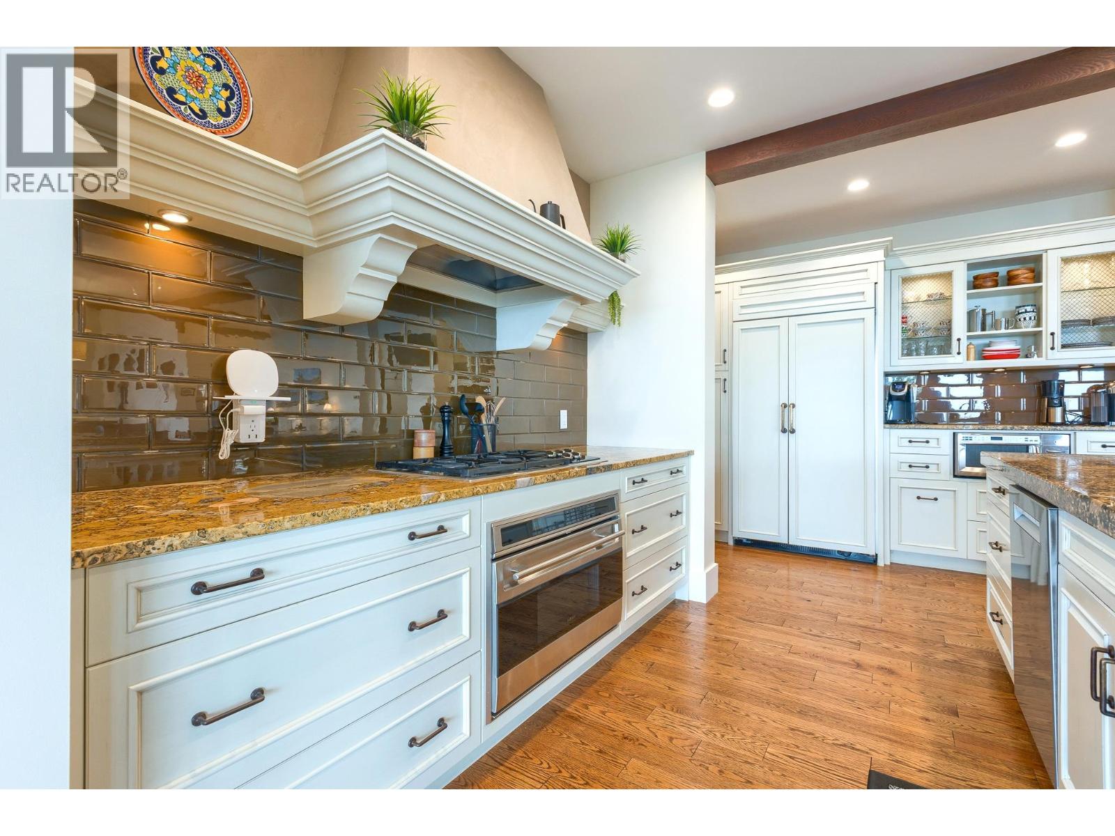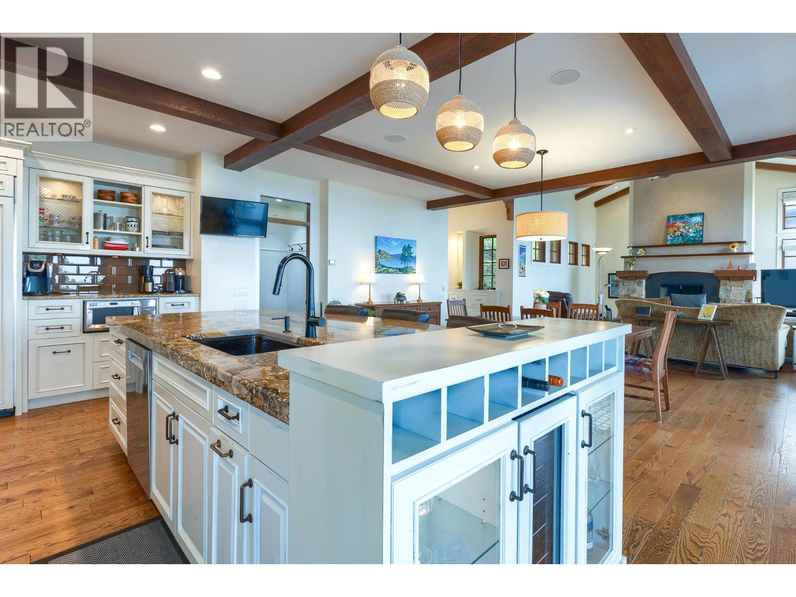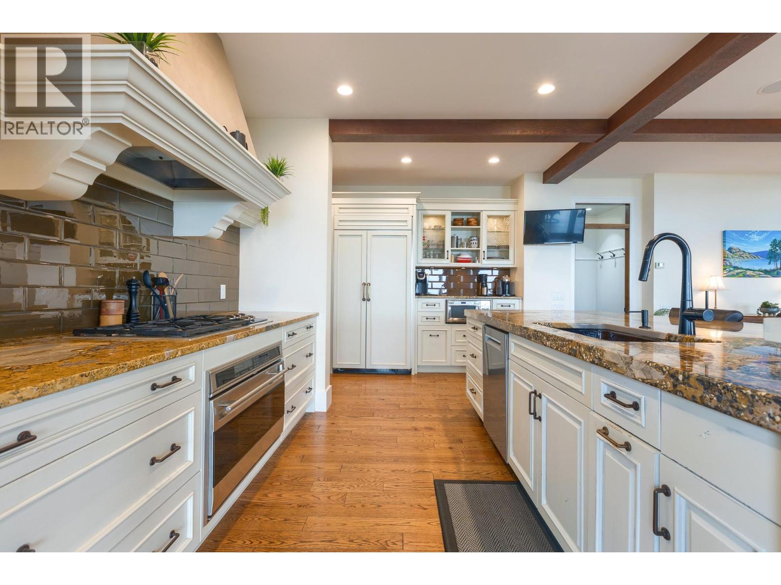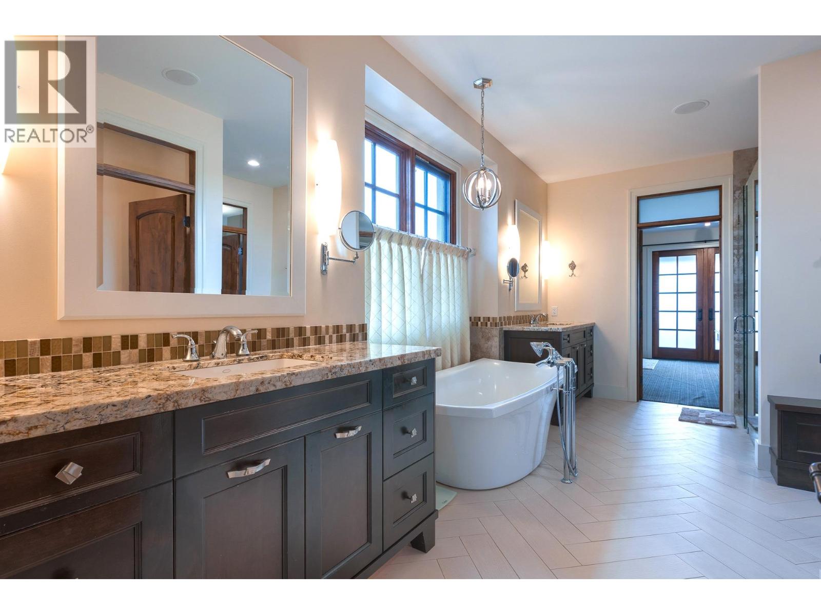 This extraordinary home on Dilworth Mountain is perfectly positioned to capture breathtaking panoramic lake, city, and mountain views. Arrive through the gated, private courtyard, where a tranquil water fountain sets the tone for the elegance within. Designed for both entertaining and everyday comfort, the home seamlessly blends indoor-outdoor living with soaring vaulted ceilings, expansive nano glass doors leading to a large deck, bringing the outdoors in. The gourmet kitchen is appointed with top-of-the-line appliances, granite counters, alder cabinetry, travertine finishes, and a pantry providing additional storage. The great room exudes warmth and relaxation with its floor-to-ceiling fireplace, exposed beams, and rich hardwood floors. Upstairs, the lavish primary suite is a sanctuary unto itself, featuring a lounge area with fireplace and French doors to a deck showing off the spectacular city and lake views. The fully equipped ensuite offers a double shower and stand-alone tub, complemented by an oversized walk-in closet, dressing room, and private laundry. A flex room off the ensuite provides space for an office/nursery and has its own private and shaded deck. The lower level boasts three bedrooms and two bathrooms, along with a cozy living room that flows directly to the pool deck. This level also includes a wet bar, fireplace, and secondary laundry. Outdoors, soak in the stunning views from any of the 5 decks/sitting areas, the sparkling pool, or by the stone fireplace. The yard is framed by lush landscaping and fruit trees, creating a private and peaceful retreat. Completing this exceptional property is a spacious double garage, offering ample room for vehicles and storage. (id:62999)