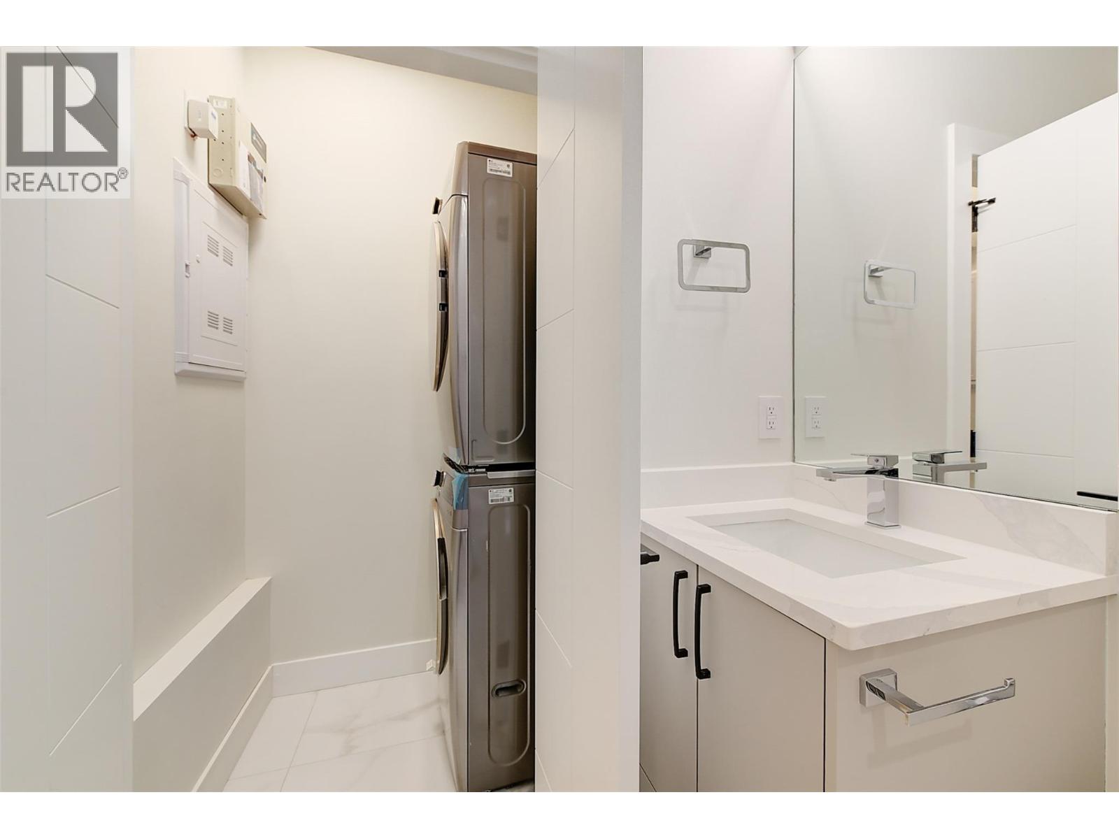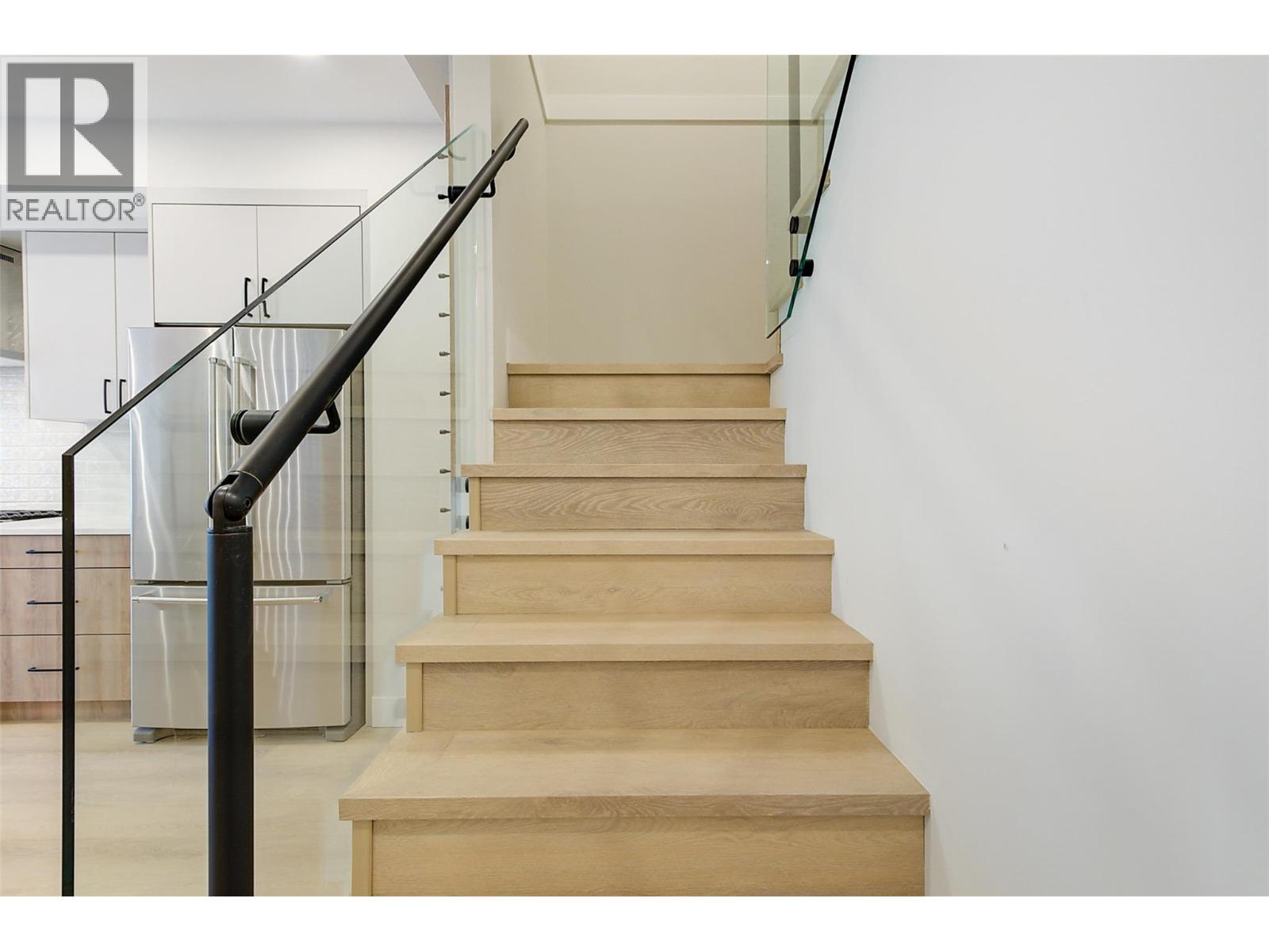 Discover Luxury Downtown Living - Step into this custom-built, North-facing townhome, offering 3 bedrooms, 2.5 bathrooms, and two stories of exquisite design. Topped with a rooftop patio prepped for a hot tub, this home invites you to embrace the Okanagan’s signature outdoor lifestyle. Every detail has been carefully curated to exude sophistication. Expansive windows fill the space with natural light, complementing the modern exterior of concrete and wood finishes. Inside, the chef-inspired kitchen stands out with a large island, stainless steel appliances, quartz countertops, and a custom backsplash framing the gas stove and 28-inch hood range fan. Throughout the home, premium flooring, a built-in fireplace, and contemporary light fixtures enhance the luxurious ambiance. The primary suite features a spa-like ensuite with a double vanity and a sleek walk-in shower. A large crawl space on the main floor offers ample storage, while the private yard with a covered patio creates your personal oasis. Completing the home is a covered single-car garage with rough-in for an EV charging station, blending convenience with modern living. This townhome isn’t just a residence—it’s a statement of style, comfort, and urban sophistication. Make it yours and elevate your lifestyle today. (id:62999)
