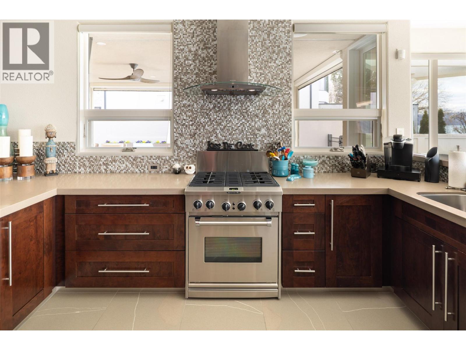 Rare offering on the shores of Okanagan Lake. This one-level lakeshore home in Kelowna’s coveted Lower Mission offers modern comfort with exceptional privacy. Set at the end of a quiet no-thru road, the .49-acre property boasts over 105 ft of level beachfront, mature landscaping, and a shared dock with boat and Seadoo lifts. Spanning over 3,600 sq ft, this 3-bed, 3-bath rancher with 1 bed/1 bath guest house is designed for effortless indoor-outdoor living, featuring floor-to-ceiling sliding doors and stunning lake views from nearly every room. The gourmet kitchen is perfect for entertaining, complete with custom cabinetry, expansive counters, professional-grade appliances—including a gas range, double oven, and dual dishwashers—and a charming breakfast nook with lake views and patio access. The generous primary suite offers direct patio access, a spa-inspired ensuite, and a walk-in closet with a skylight and center island. A detached guest casita with its own bed and bath provides the ideal retreat for visitors. Outside, the expansive patio with built-in BBQ, outdoor kitchen, ceiling fan, and heaters sets the stage for lakeside gatherings. Additional highlights include a triple garage, smart home features, heated floors, and a private hot tub. A rare opportunity to live lakeside in one of Kelowna’s most sought-after neighbourhoods, just minutes to downtown, world-class wineries, and local golf courses. (id:62999)