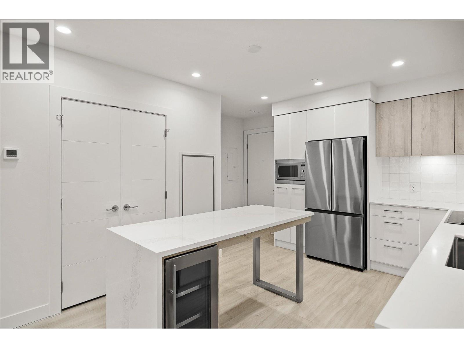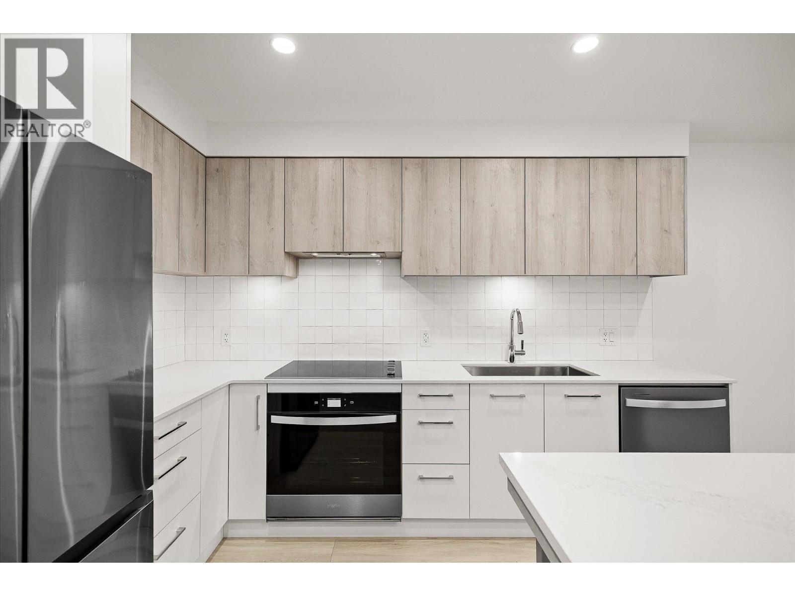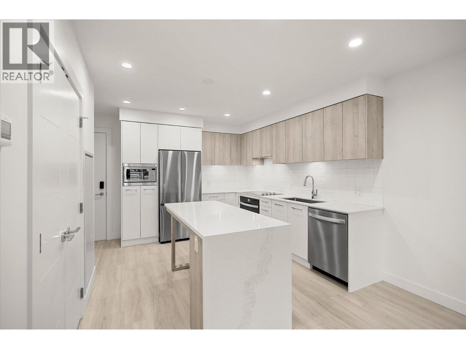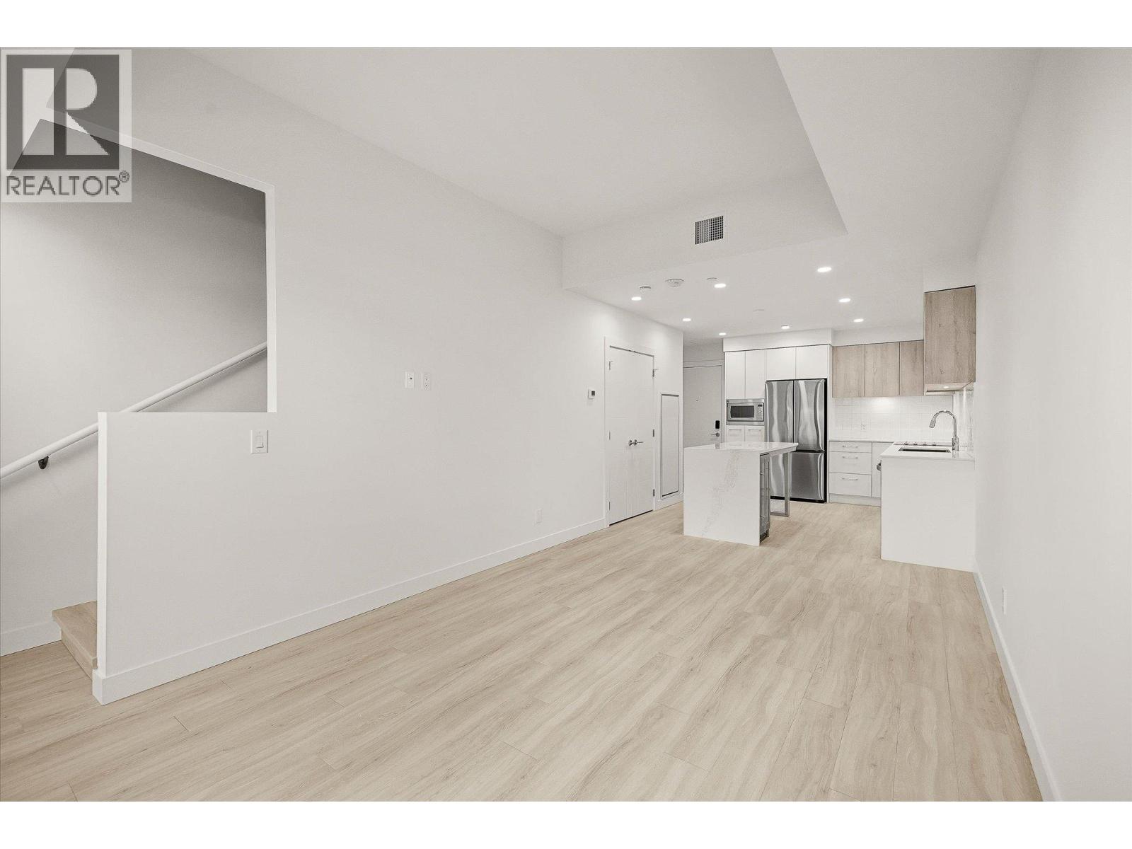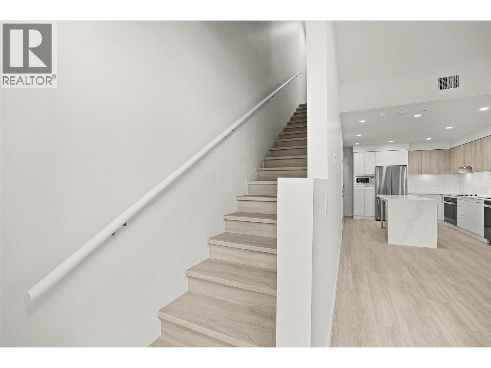 Welcome to Aqua Waterfront Village, Kelowna’s premier lakefront community in Lower Mission. This 2-storey, 2 bed, 2 bath townhome offers approx. 1,015 sqft of interior living, 155 sqft of exterior space, and includes a private, tandem 2-car garage in the building's parkade. The main floor features a bright, open-concept layout with oversized windows providing ample natural light. Luxury wide-plank vinyl flooring extends throughout the kitchen, living, dining, and bedroom areas. The kitchen showcases modern two-toned cabinetry, polished quartz countertops, dining island, integrated LED lighting, and a premium stainless steel appliance package that includes a wine fridge. Upstairs, you’ll find 2 generous bedrooms and 2 contemporary bathrooms featuring quartz vanities, porcelain tile and stylish finishes. Additional touches include blackout roller shades in the primary bedroom, custom closet organizers in both bedrooms and an energy-efficient central heating/cooling system. 1 storage locker, 1 bike locker included. Amenities include: an outdoor pool and hot tub, gas fire pits and BBQ’s, a fireside lounge and co-working area, 2-level fitness centre, pet wash and bike wash and maintenance area. Vacant and ready for quick possession. Only a 5% deposit required. Buyer to verify all details and measurements if deemed important. All offers must be written on the Developer’s CPS. (id:62999)
