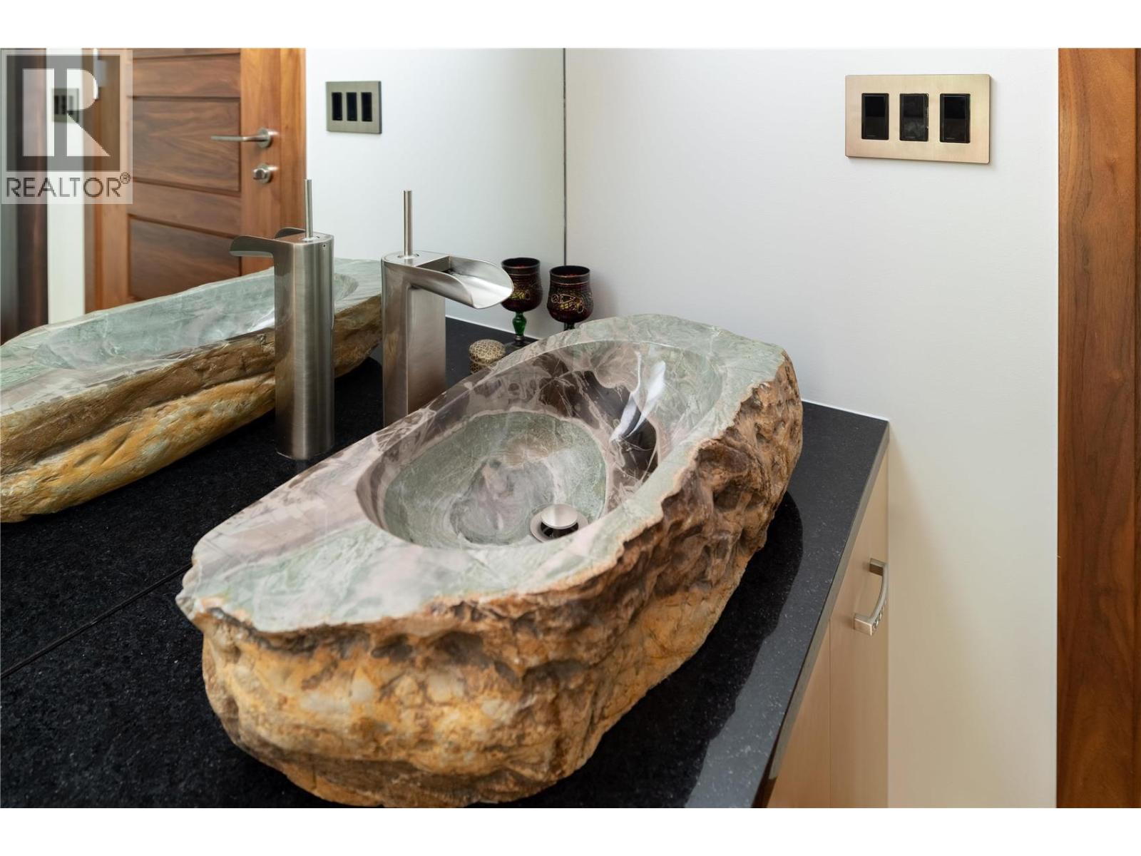 Tranquil Waterfront and Creekside Retreat. This gorgeous custom home is situated on a private 1.22 acre property along the shores of Okanagan Lake and offers 185 feet of water frontage. Lebanon Creek borders the property to the south. Designed by Architect Everest Lap and interior design by Ines Hanl this home is an energy efficient oasis ""connecting back to the earth."" Meticulous attention to detail and design is found throughout the over 4,600 sq ft residence with every room taking full advantage of the lake and forest views, bringing the outdoors in. Exterior has been finished with Kettle Valley granite and incorporates seamlessly into the surroundings. Natural materials span the home with custom rock and tile work, rich wood cabinetry, and beautiful walnut floors. Upon entry you'll notice the soaring 29 ft. ceilings in the kitchen creating a grand space for hosting and entertaining. The high-end kitchen features a curved island, custom Sycamore and Walnut veneer wood cabinets with professional appliances that will delight any chef. Living room was designed to hold a grand piano with a panel of 5 windows that accordion to the patio to allow for an unparalleled indoor to outdoor living experience. Backyard offers a swim spa and hot tub that are both privately nestled into the landscape. Well-designed and constructed wharf system at the beautiful expansive shoreline. For those seeking a tranquil retreat with seamless access to the waterfront this is the ideal property (id:62999)