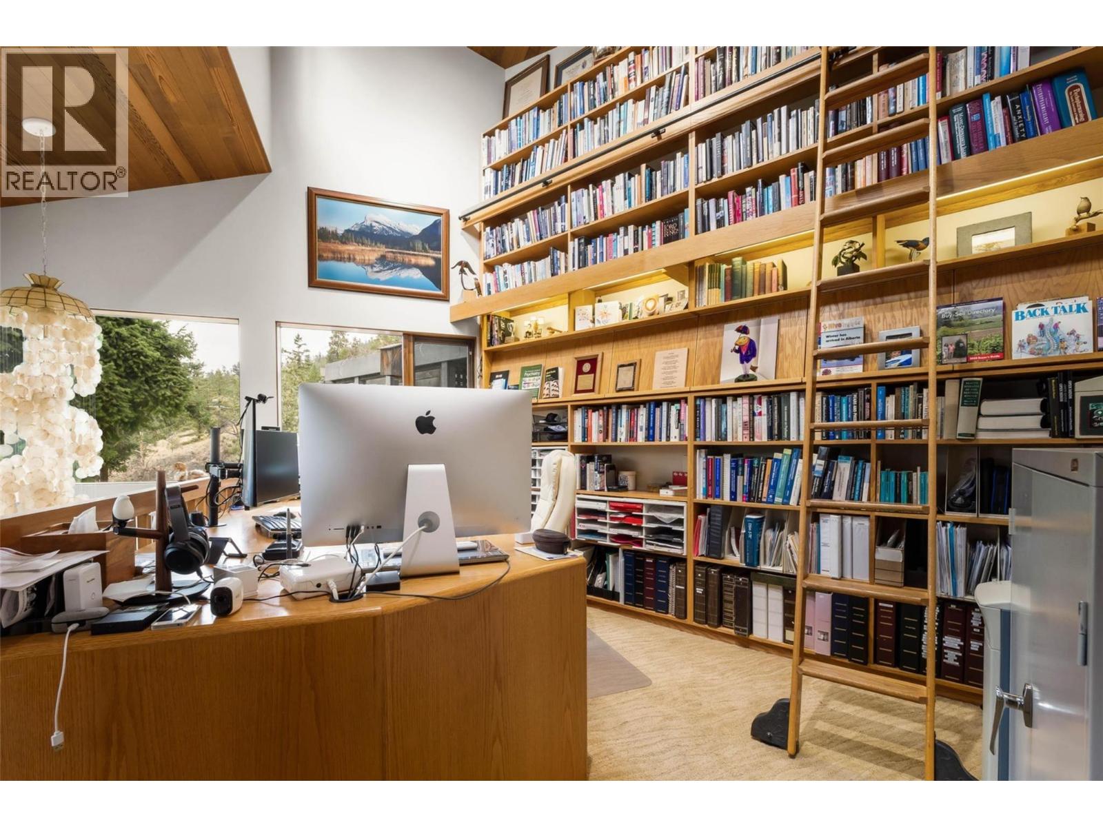Discover your own private lakeside retreat, where timeless architecture meets the natural beauty of the Okanagan. Designed by Dan Pretty and meticulously maintained by its original owners, this 2,500+ square feet home showcases true craftsmanship and tranquility. Vaulted ceilings and rich natural wood create warmth throughout, while expansive windows frame ever-changing views of the surrounding trees, stream, and sparkling lake. The main living area centers around a striking stone fireplace- an inviting focal point for gatherings and relaxation. Downstairs, a charming family room with an antique brick fireplace adds cozy, rustic appeal. The well-designed kitchen opens to an upper deck, ideal for morning coffee or al fresco dining under the stars. The spacious primary suite features a private deck and hot tub, offering a serene retreat at day’s end. A loft-style study with a rolling ladder provides a peaceful nook for reading or work, and each bedroom enjoys its own unique connection to nature. The beautifully landscaped grounds feature mature trees, a meandering stream, and abundant wildlife, creating a true sense of seclusion. At the water’s edge, a private beachfront awaits, complete with a dock, an outdoor kitchen, and a sleeping area, perfect for unforgettable Okanagan summers. With a heated workshop, ample storage, and five pristine acres to call your own, this rare property offers endless possibilities- whether you move in and enjoy as-is or create your dream lakeside estate. (id:62999)