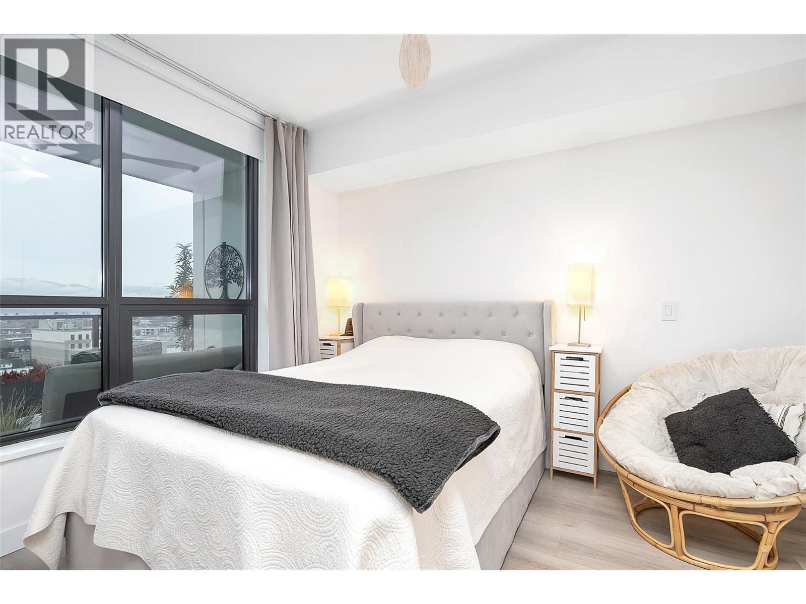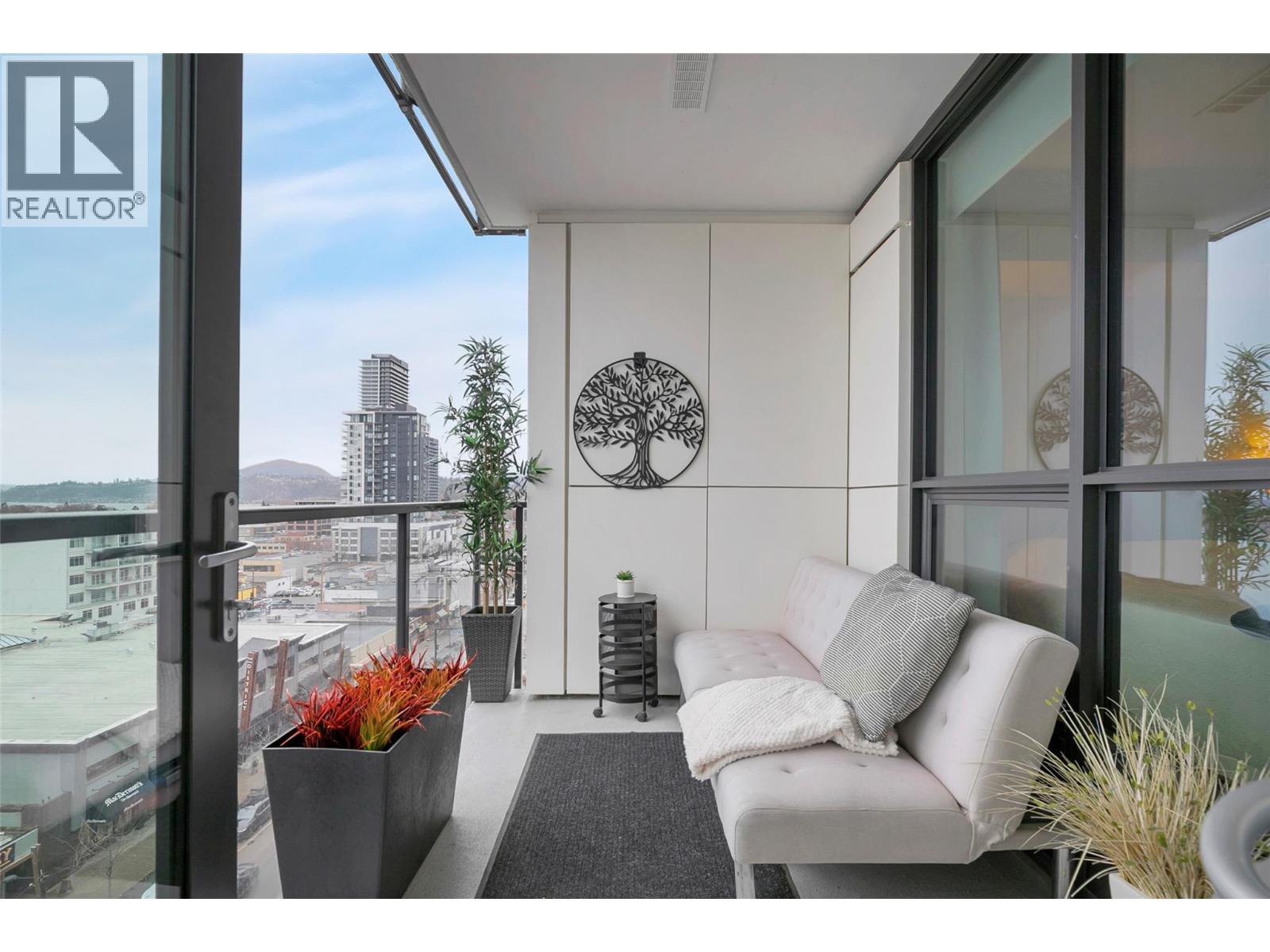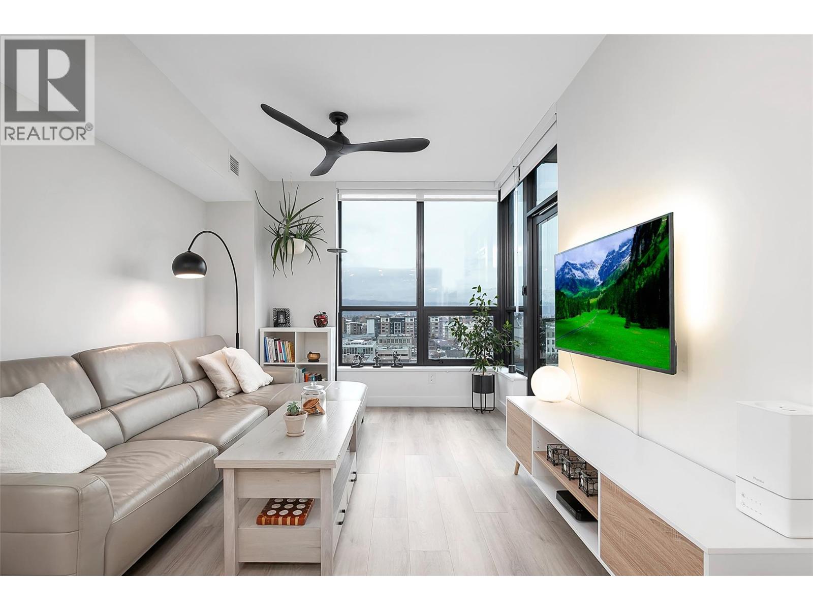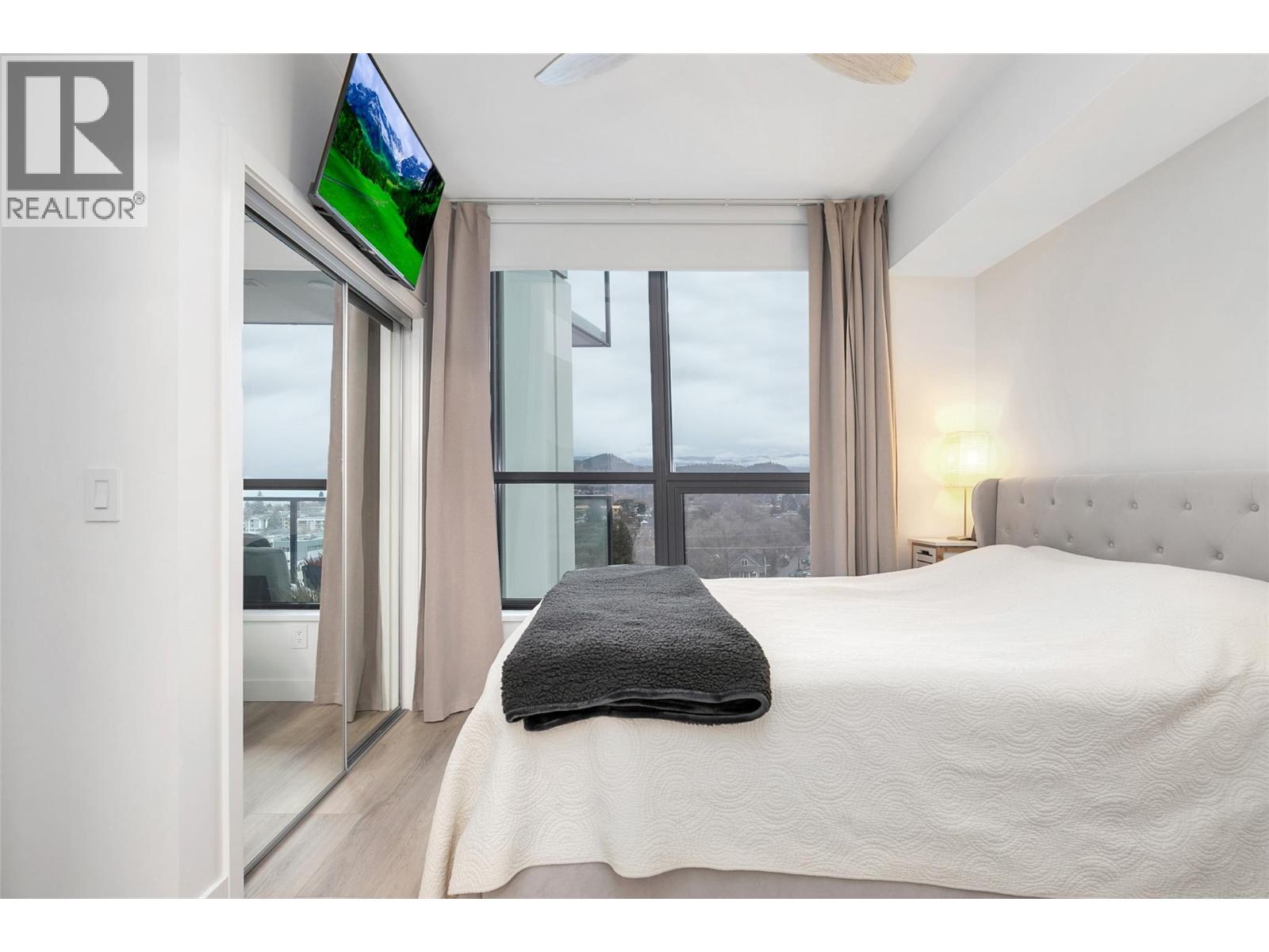 Welcome to Bertram — this bright 2-bedroom, 2-bathroom condo on the 9th floor is located walking distance to Lake Okanagan. Built in 2024, this bright southeast-facing corner unit showcases lake, city, and valley views through large windows that flood the home with natural light. This thoughtfully designed 805 sq. ft. residence features a split-bedroom layout for privacy, air conditioning, and an open-concept living space ideal for modern living. The sleek contemporary kitchen is equipped with quartz countertops, stainless steel appliances, and clean modern finishes. Step out to your private covered deck and enjoy your morning coffee with a view. Residents enjoy impressive resort-style amenities, including a rooftop heated pool and spacious hot tub with 360-degree views, outdoor BBQ and lounge areas, bocce ball court, community gardens, a fully equipped fitness centre, dog run and dog wash, secure bike room, and multiple indoor lounges and workspaces. Included are one secure parking stall and a dedicated storage locker and a secured bike locker. Experience true lock-and-leave convenience, just steps to Okanagan Lake, waterfront walking paths, groceries, shopping, Pilates studios, and some of Kelowna’s best restaurants. (id:62999)