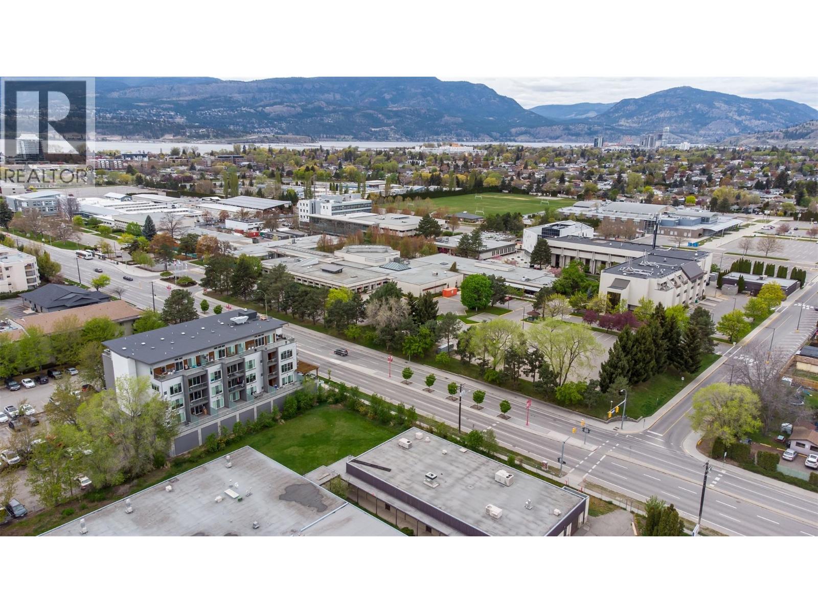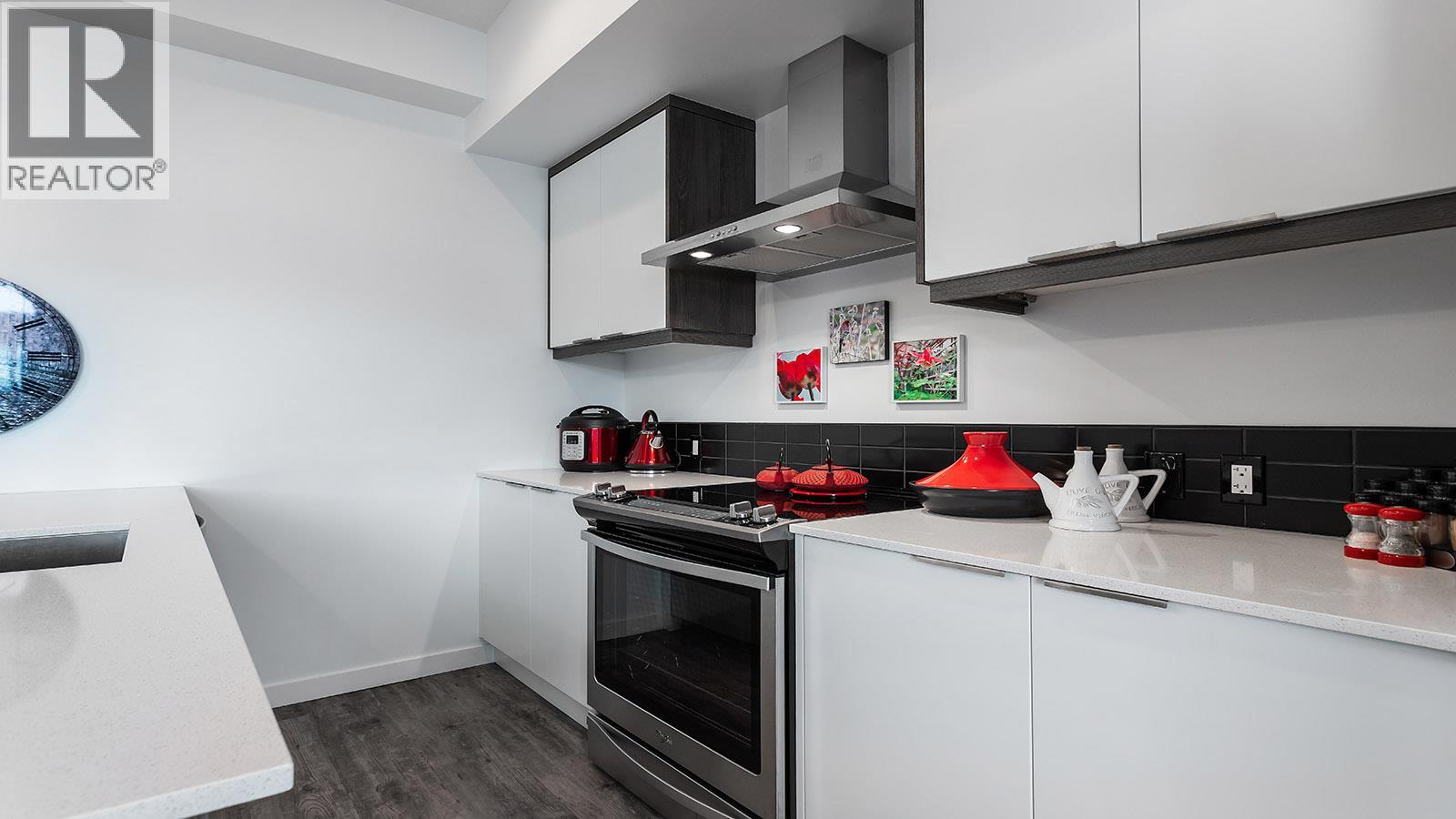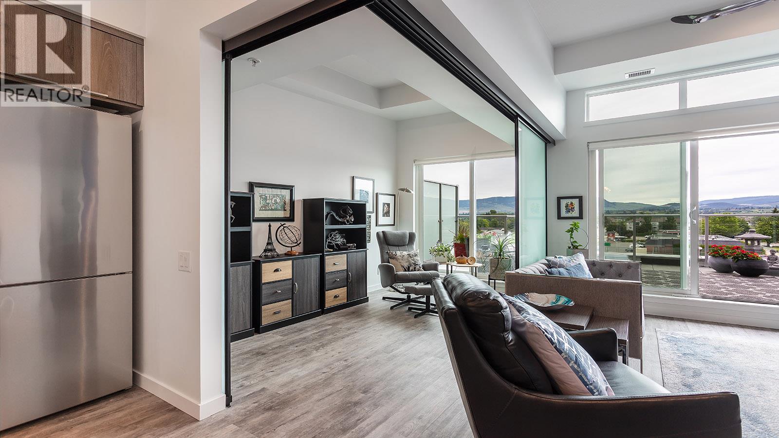 Welcome to SOLE on KLO — a bright, contemporary retreat perfectly positioned in the heart of the Lower Mission. This 1 bedroom plus den, 1 bathroom residence offers effortless modern living with a rare nearly 300 sq. ft. outdoor terrace capturing expansive east-facing mountain views and gentle morning light. Inside, an open-concept layout is enhanced by sleek finishes, including quartz countertops, stainless steel appliances, modern cabinetry, and durable vinyl plank flooring. The spacious den provides valuable flexibility, easily functioning as a second sleeping area with room for a queen Murphy bed, ideal for guests or hybrid living needs. The bedroom is paired with a well-appointed bath featuring clean, modern lines and a glass-enclosed shower. Large windows and sliding doors draw natural light throughout the home while seamlessly connecting the interior living space to the oversized terrace, perfect for outdoor dining, relaxing, and taking in the panoramic landscape. Additional features include in-suite laundry and a generously sized parking stall. Located directly across from Okanagan College and moments from the boutiques, cafes, and waterfront pathways of Pandosy Village, this residence offers exceptional walkability and a vibrant urban lifestyle. (id:62999)