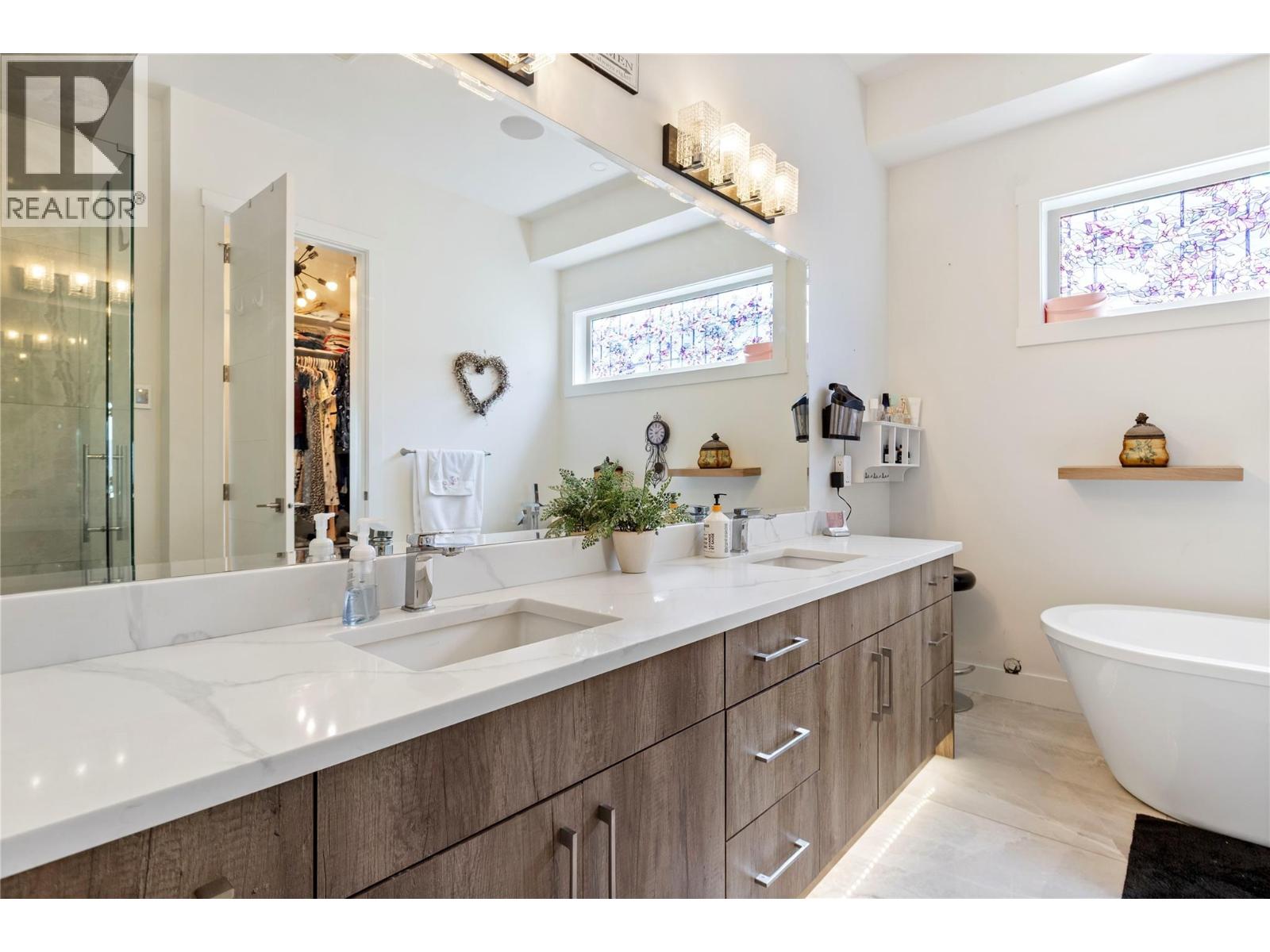You are going to love the view from this beautifully designed walkout rancher in the sought-after Kirschner Mountain area. Offering 6 bedrooms and 5 bathrooms over 4,200 square feet, this home blends modern luxury with stunning lake and city views. Enjoy the breathtaking scenery the moment you walk inside. The main level features 3 bedrooms, 2 full bathrooms, and a half bath with in-floor heating. Highlights include high ceilings, a gas fireplace, hardwood floors, and an open-concept kitchen with stainless steel KitchenAid appliances. A large sundeck extends the living space outdoors, making it perfect for entertaining. The lower level includes 2 additional bedrooms, a full bathroom, a spacious rec room with a wet bar, and a fantastic soundproofed media room—ideal for sports and movie enthusiasts. There’s also a legal 1-bedroom suite with a private entrance and separate utilities, perfect for rental income or extended family. Additional features include central air conditioning, forced air and baseboard heating (electric and natural gas), a built-in vacuum, and a complete security system with surveillance cameras. The 0.24-acre lot offers a private yard with underground sprinklers and space for a pool. An attached double garage provides ample parking and storage. This is a high-quality home in a quiet, family-friendly neighborhood—ideal for comfortable living and entertaining. (id:62999)