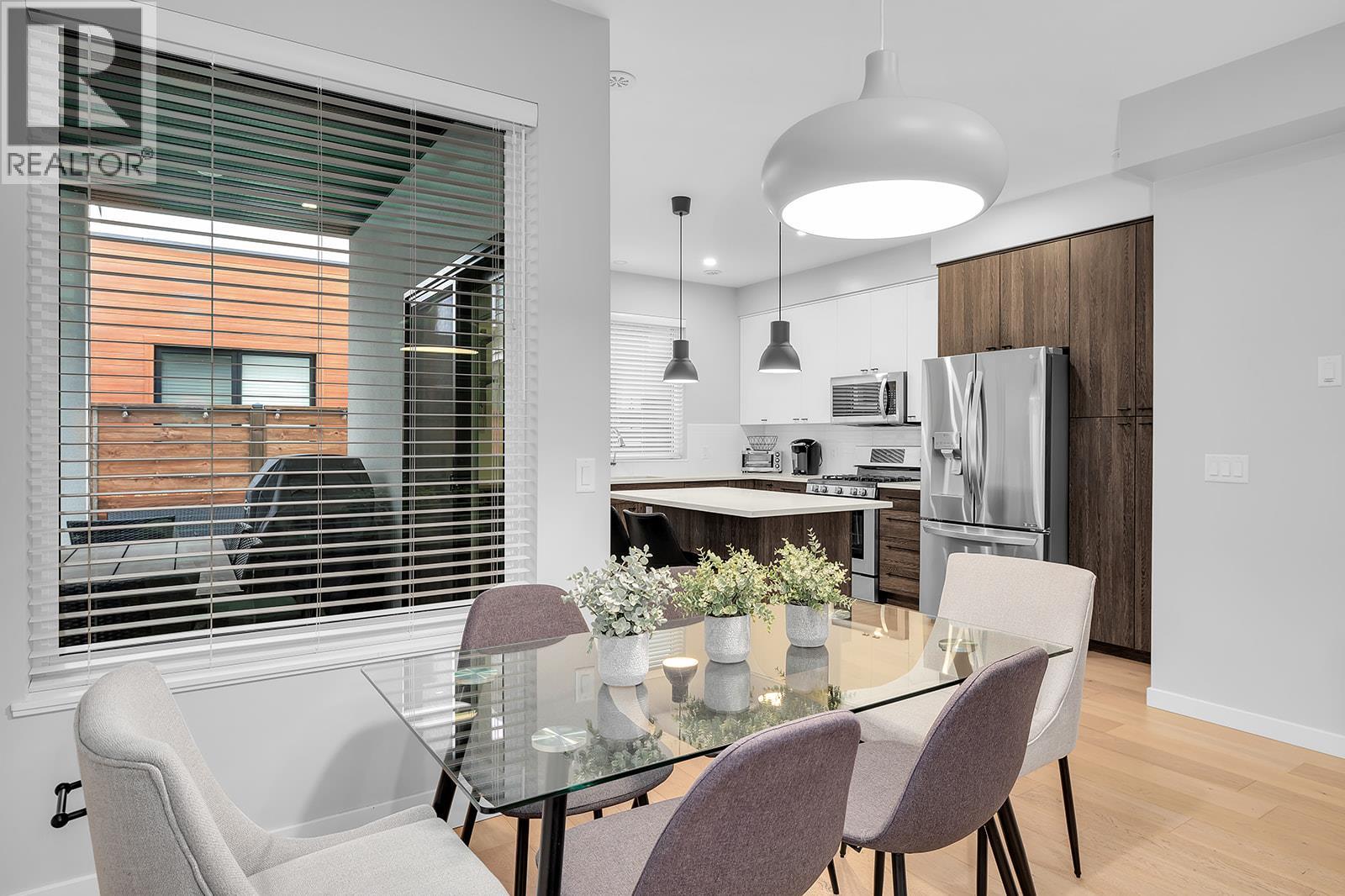 Located in Kelowna South, this 2-storey townhome offers an organized layout, private outdoor space, and a walkable lifestyle close to everything that matters. Approximately 1,545 sq ft is thoughtfully designed with a welcoming foyer that opens into connected living, dining, and kitchen spaces, creating an easy flow for everyday life. The kitchen stands out with sleek quartz countertops, high end stainless steel appliances, and modern pendant lighting, with direct access to the covered patio and small fenced yard featuring low maintenance synthetic turf. A main floor bedroom adds flexibility for guests or a home office, alongside a convenient 2 piece bathroom and utility closet. Upstairs, the primary bedroom is set apart with a walk-in closet and private ensuite, while two additional bedrooms share a full 4 piece bathroom. Laundry is located on the upper level for everyday convenience. Large windows and skylights bring in natural light throughout both levels. A detached single-car garage accessed from the rear laneway adds functionality, all within an intimate four-plex setting. The front porch adds charm and curb appeal, while the backyard offers a quiet spot to unwind. Set in a central, walkable Kelowna South location, beaches, shopping, dining, transit, KGH, and schools are all within an easy stroll. Ideal for those looking to upgrade, or investors seeking a well located townhome with strong lifestyle appeal. (id:62999)